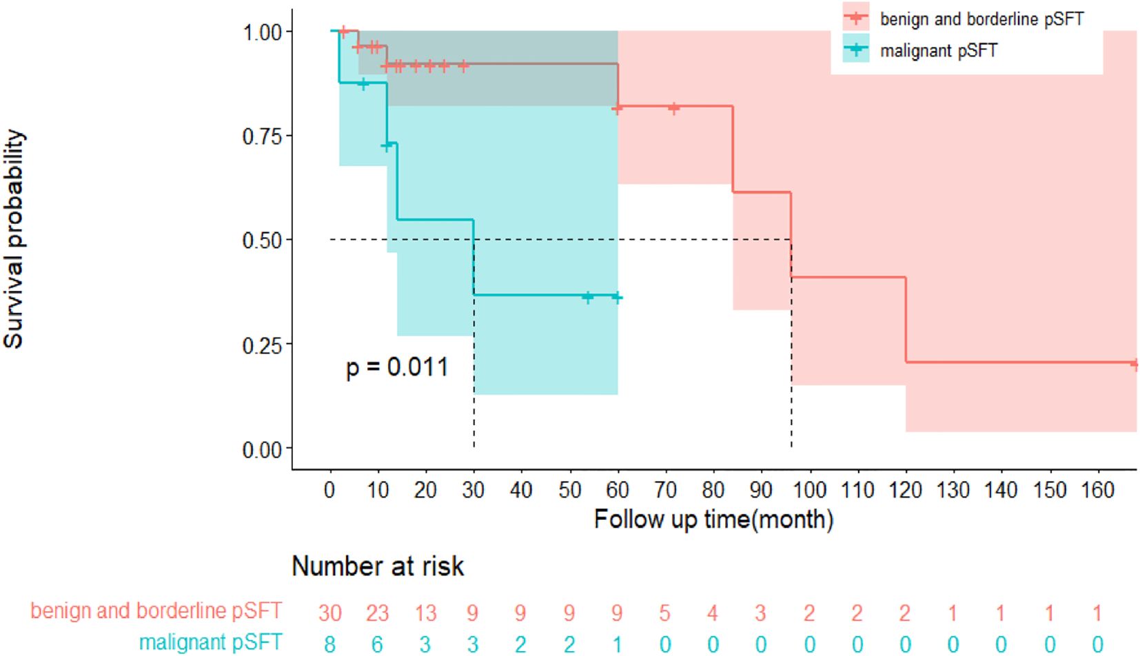 Notably, of the 74 pSFT cases, only 38 pSFT cases had follow-up records and follow-up time, and the follow-up time range was 2 to 168 months. To be more specific, 26 cases of pSFT were benign, 10 cases of pSFT were malignant, and 2 cases of pSFT were borderline. Importantly, Figure 5 suggested that there was significant difference of disease-free survival (DFS) between benign and borderline and malignant tumors (P=0.011, Log-rank test). However, due to incomplete time-to-event data, hazard ratios could not be calculated reliably.