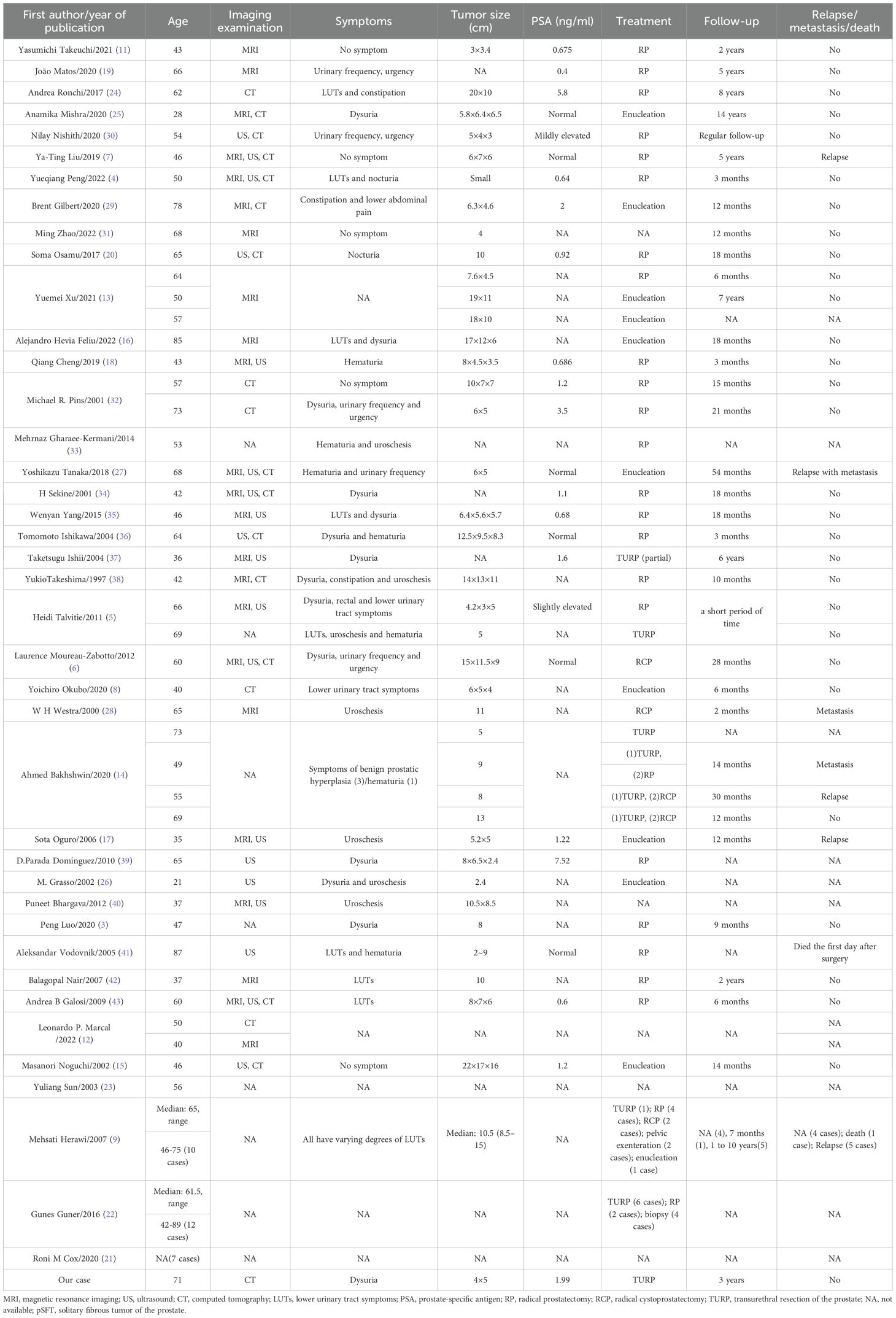 Ultimately, forty literatures (3–9, 11–43) were included with 74 cases of pSFT, and age ranged from 21 to 89 years (mean 57.5 years, median 61.5 years). The clinical manifestations depend on the size of the tumor and whether the tumor involves surrounding organs. Specifically, three patients were asymptomatic, five patients had hematuria, two patients had lower abdominal pain, and the remaining patients had mild or severe lower urinary tract symptoms. Except for 3 pSFT cases with slightly increasing PSA levels, the PSA values of other cases (including our case report) were in the normal range. The basic characteristics of pSFT are shown in Table 1.