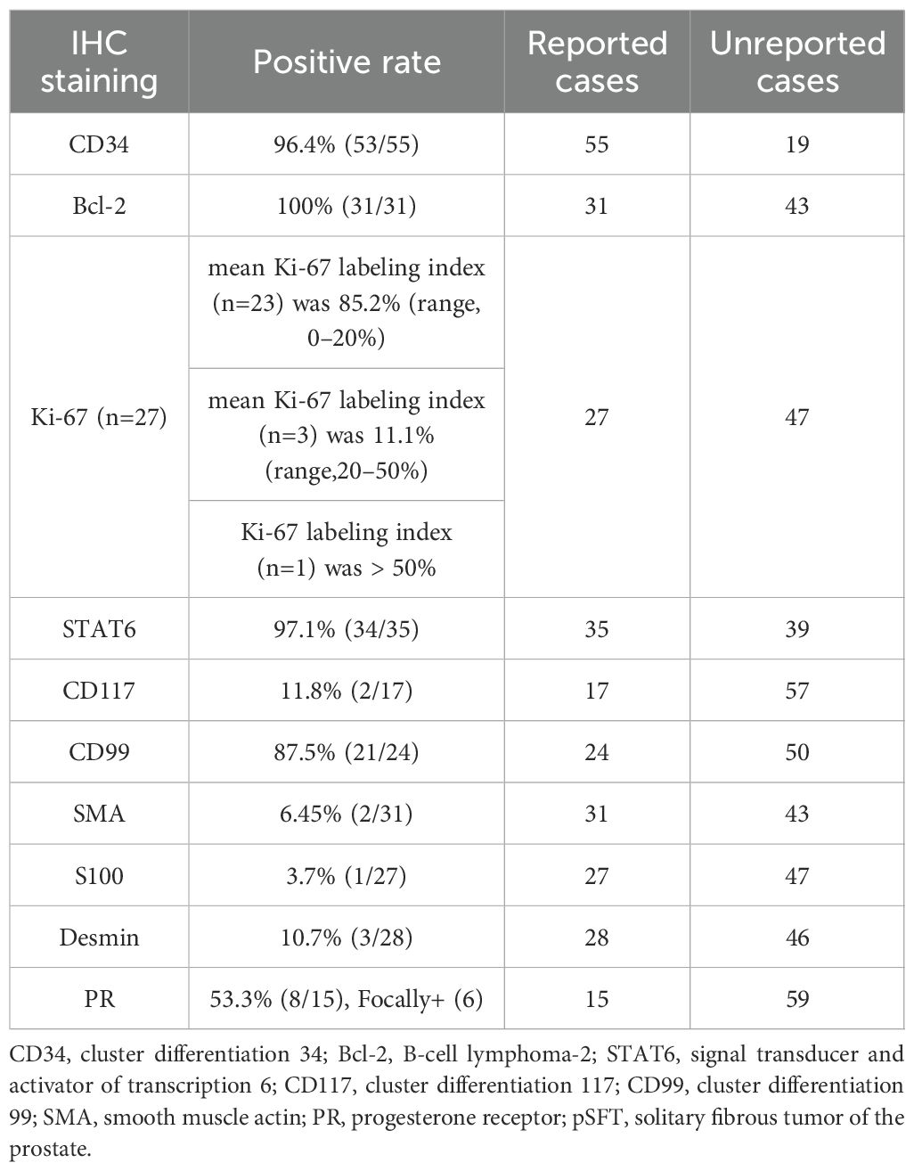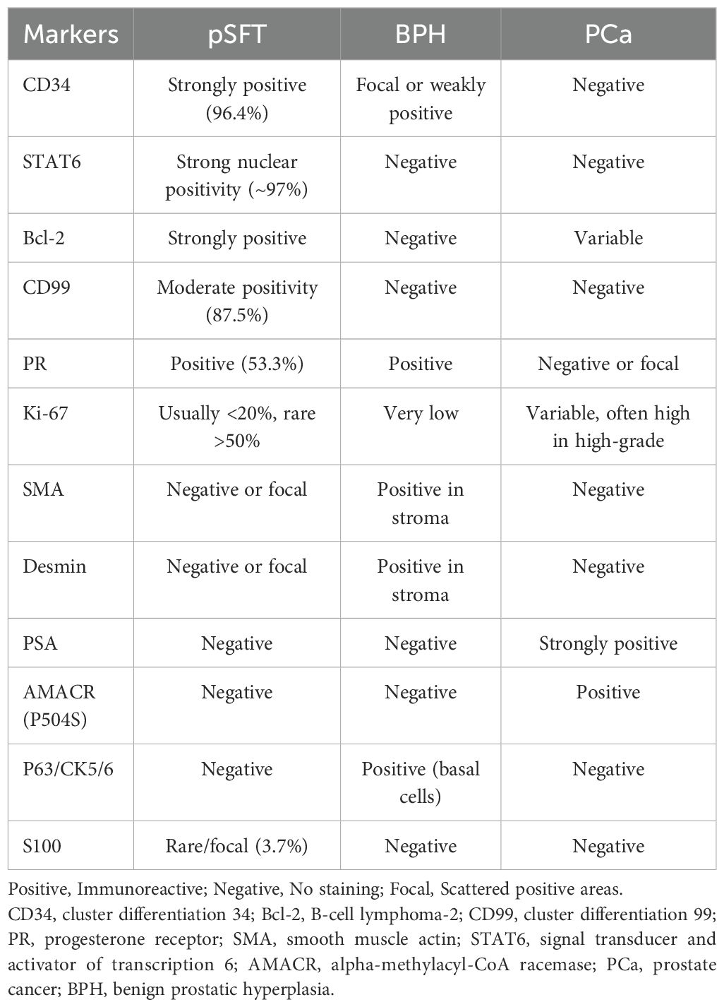 Refer to previous studies (4, 8, 52–54), Table 4 summarized immunohistochemical markers of pSFT, BPH and pCa. Over 95% of SFT cases exhibit the NAB2-STAT6 gene fusion characteristic. Therefore, positive STAT6 immunohistochemical staining and/or detection of the NAB2-STAT6 gene fusion can significantly enhance the accuracy and consistency of SFT diagnosis. Currently, the STAT6 gene and its immunohistochemical detection are recognized as highly sensitive and specific markers for the diagnosis of SFT (9–11, 55). Early studies reported that STAT6 expression might occur in cases of prostatic stromal hyperplasia, but recent studies (14, 21, 22, 56, 57) have demonstrated that this expression is absent when detected with monoclonal STAT6 antibodies. The effectiveness of monoclonal STAT6 antibodies has been validated, showing higher sensitivity and specificity in distinguishing pSFT from prostatic stromal hyperplasia. Additionally, Bakhshwin A (14) reported findings from the treatment of four cases of mSFT, highlighting that the expression of GATA3 and PR, along with monoclonal STAT6 immunoexpression, may aid in distinguishing mSFT. Our study revealed that approximately 53.3% (8/15) of pSFT cases exhibited PR expression. However, this finding differs from Bakhshwin A’s report, suggesting that PR expression may also occur in benign SFT. Additionally, when STAT6 testing fails to provide a definitive diagnosis, pathologists are advised to perform a comprehensive analysis using additional immunohistochemical markers. Studies on aldehyde dehydrogenase 1 (ALDH1) have demonstrated that combining STAT6 and ALDH1 staining techniques can significantly enhance the specificity of prostate SFT diagnosis (22, 58). This approach has garnered increasing attention and application in recent studies. Interestingly, two cases of prostate SFT reported in previous literature (6, 9) unexpectedly revealed focal areas of prostate adenocarcinoma. This finding suggests that clinicians may perform a more comprehensive differential diagnosis when evaluating pSFT to avoid overlooking potential coexisting lesions, thereby enhancing diagnostic accuracy and reliability.