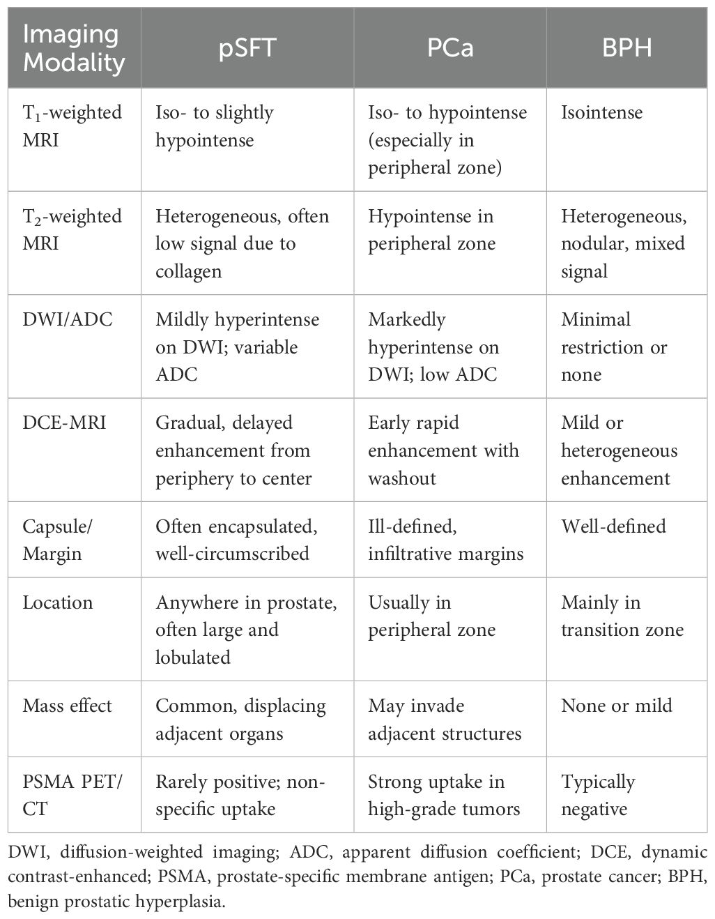 To better differentiate pSFT from prostate cancer (PCa) and benign prostatic hyperplasia (BPH), and refer to previous studies (6, 7, 11–13, 16–20, 40, 44–49), the key imaging features are summarized in Table 3. According to included literature, MRI is more preferred in recent years, which has the characteristics of clear differentiation of soft tissue structures, high resolution and multi-sequence imaging analysis. While US examination is mainly used for the initial screening of lesions and localization for biopsy site. The most characteristic sign of enhanced CT scan is the continuous and gradual enhancement of the tumor from the periphery to the center, with visible separation and capsule, which may be related to the fact that the SFT of the prostate is mainly composed of tumor spindle cells with hemangiopericytoma-like structure. Since pSFT lacks specific clinical symptoms, comprehensive preoperative imaging examinations, including US, MRI, and CT, allow for an accurate assessment of the tumor’s origin, size, morphology, and its relationship with adjacent structures (6, 12, 17). Additionally, high-resolution and small-field MRI can clearly delineate the prostate mass and its boundaries with adjacent structures, such as the bladder wall and rectal layers. This imaging technique is crucial for surgical approach planning.