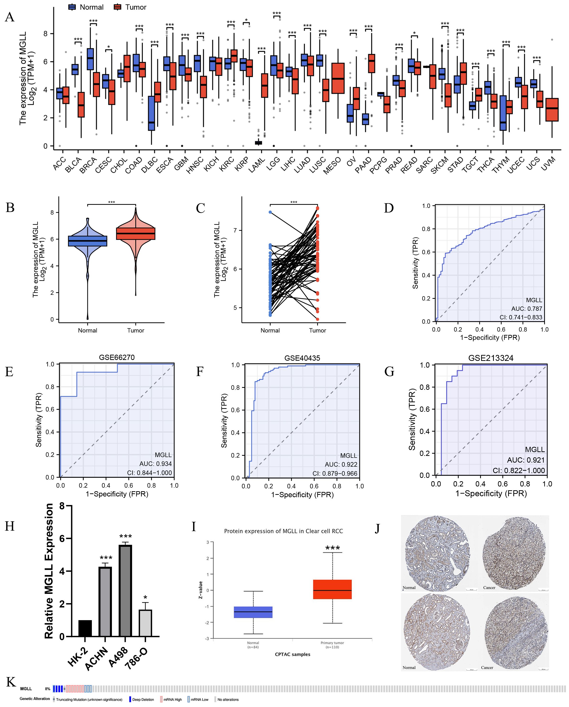 Figure 1. Expression levels of MGLL. (A) Expression levels of MGLL in pan-cancer and corresponding normal tissues from TCGA and GTEx databases. (B) Differential expression of MGLL between ccRCC (n = 531) and normal tissues (n = 100, 72 cases of adjacent tissues from TCGA and 28 cases of normal tissues from GTEx). (C) The expression of MGLL in ccRCC and normal paired tissues (n = 72). (D) ROC curve for the diagnosis of MGLL (AUC = 0.787). (E) Diagnostic ROC curve of MGLL in the GSE66270 dataset (AUC = 0.934). (F) Diagnostic ROC curve of MGLL in the GSE40435 dataset (AUC = 0.922). (G) Diagnostic ROC curve of MGLL in the GSE213324 dataset (AUC = 0.921). (H) qRT-PCR assay of mRNA expression levels of MGLL in HK-2 and ccRCC cell lines (ACHN, A498 and 786-O). (I) The protein expression levels of MGLL in ccRCC (n = 110) and normal tissues (n = 84) in the CPTAC database. (J) Immunohistochemical staining of MGLL in ccRCC and normal tissues (scale bar, 200 μm). (K) cBioPortal OncoPrint graph showing the distribution of MGLL genomic changes in ccRCC patients. *p < 0.05; ***p < 0.001.