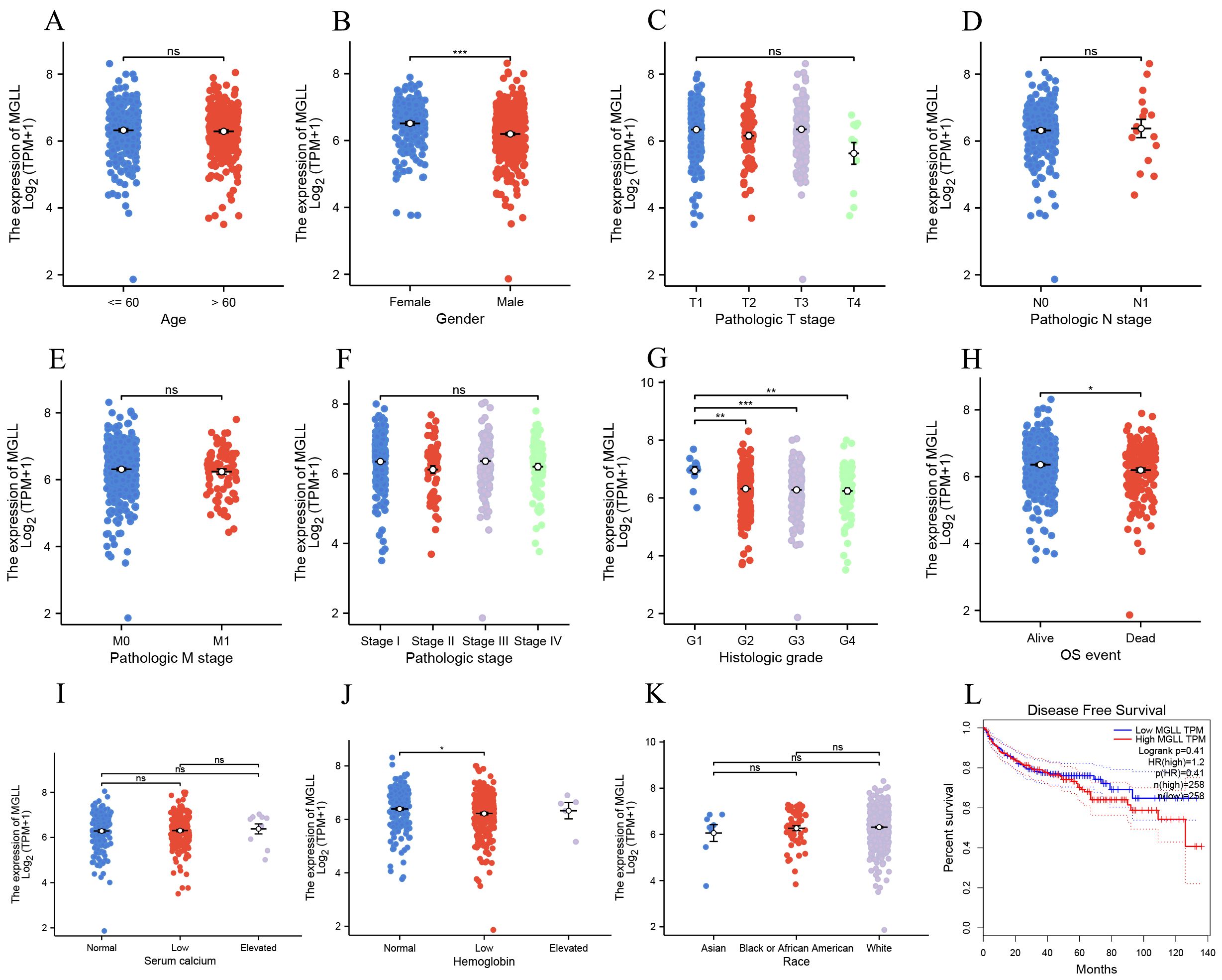 Figure 2. The expression levels in ccRCC patients with different clinical features of MGLL in TCGA database. (A) age, (B) gender, (C) pathologic T stage, (D) pathologic N stage, (E) pathologic M stage, (F) pathologic stage, (G) histologic grade, (H) OS event, (I) serum calcium, (J) hemoglobin, (K) race. (L) Analysis of disease progression-free survival curves for ccRCC patients based on the GEPIA database. *p < 0.05; **p < 0.01; ***p < 0.001; ns, no significance.