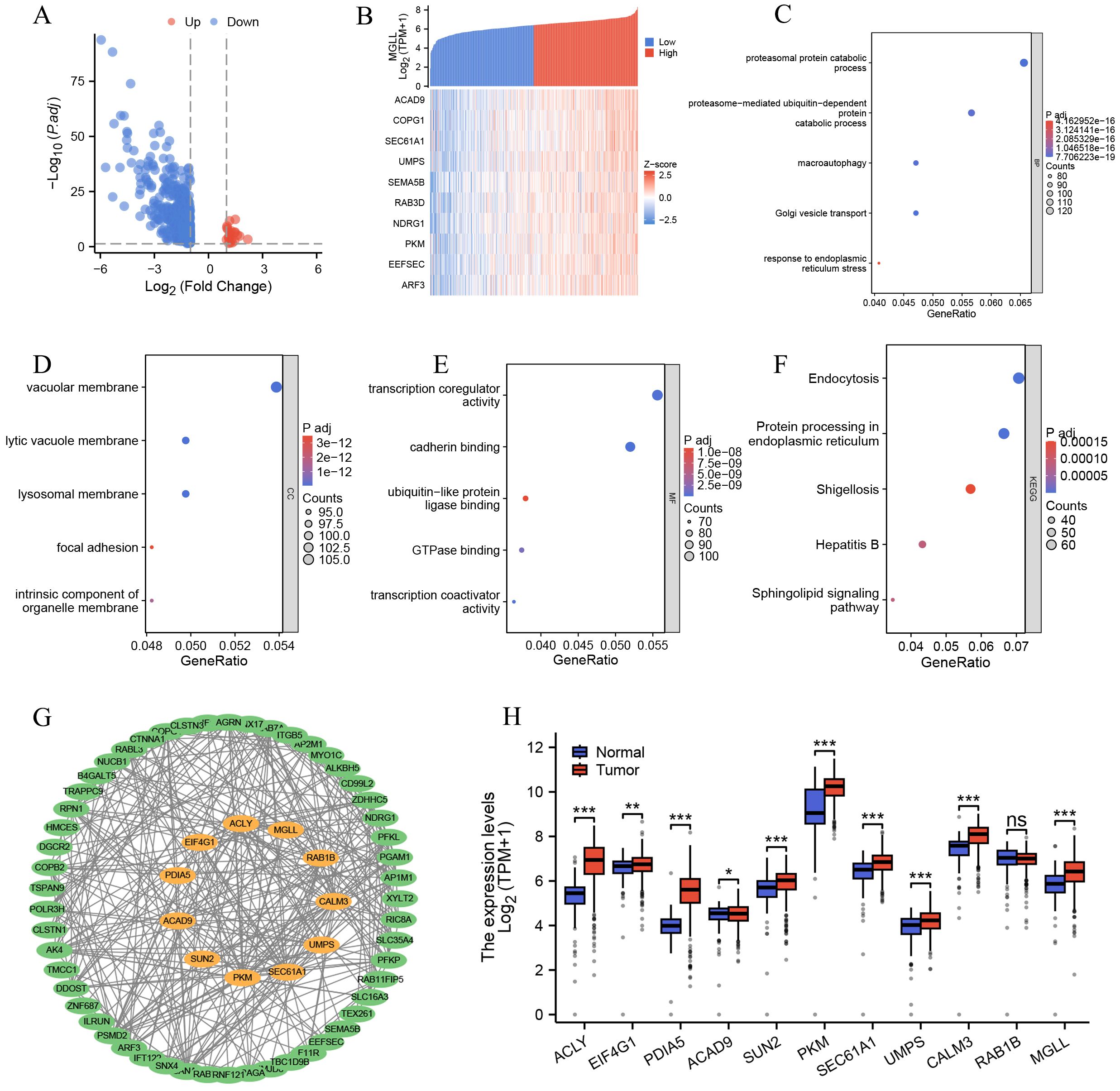 Figure 3. Functional enrichment and PPI network analysis of MGLL-related genes. (A) Volcano plot of related genes after MGLL differential analysis (|logFC| > 1, p.adj < 0.05) (n = 751). (B) Heatmap for co-expression showing the top 10 genes associated with MGLL. (C-F) Functional enrichment analysis of the biological processes, cellular components, molecular functions and KEGG pathways of MGLL-related genes (Spearman rank correlation coefficient > 0.4, p.adj < 0.05, n = 2008). (G) Analysis of PPI network and MCODE module of MGLL-related genes (Spearman correlation > 0.55, p.adj < 0.05, n = 65). The genes marked in orange in the middle are those analyzed by the MCODE module. (H) The expression of 11 genes analyzed by MCODE module in ccRCC and normal tissues. *p < 0.05; **p < 0.01; ***p < 0.001; ns, no significance.