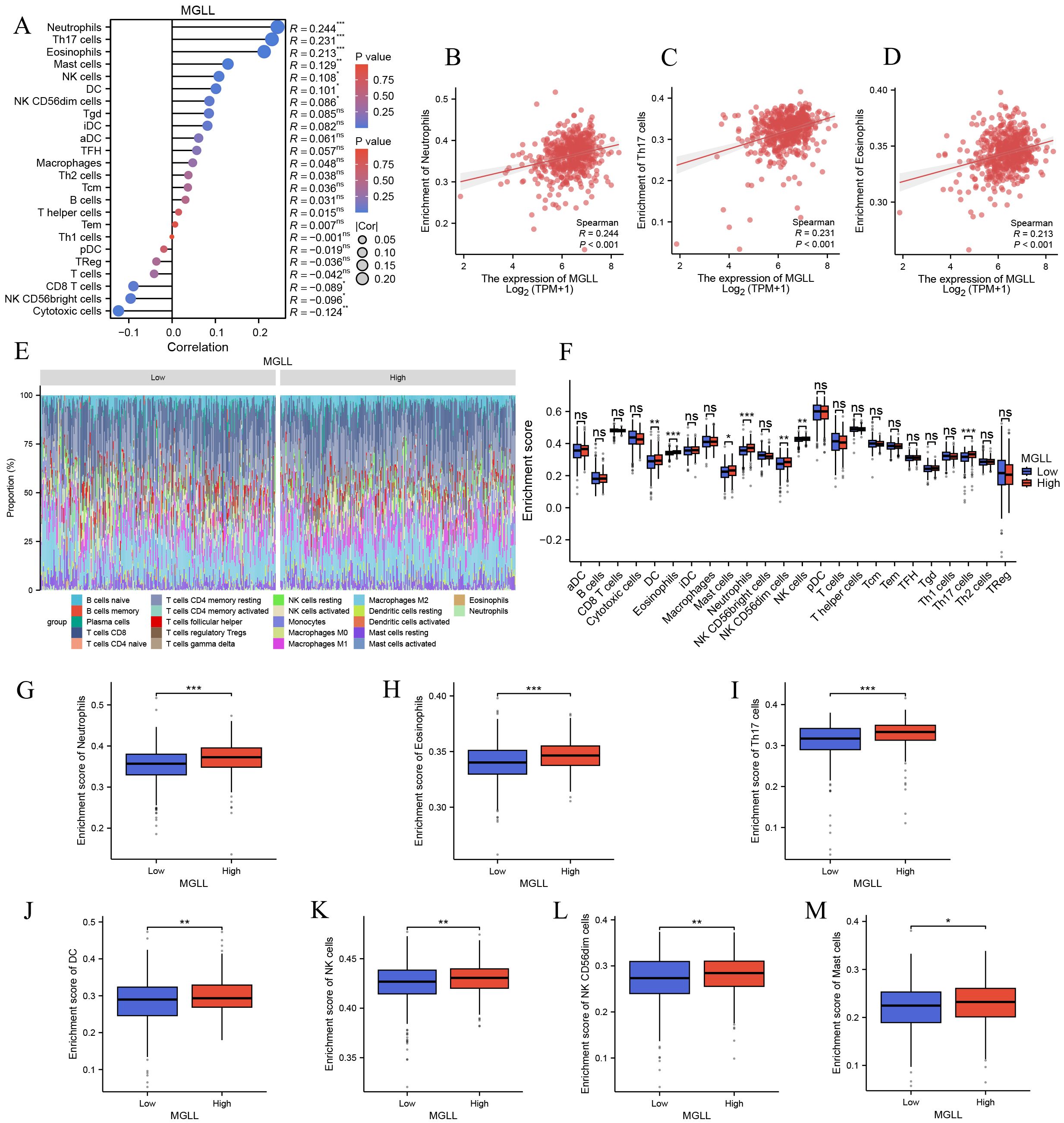 Figure 4. Correlation analysis of MGLL expression and immune infiltration in ccRCC. (A) The correlation between MGLL and immune infiltrating cells in ccRCC. (B-D) Scatter plot of the correlation between the expression of MGLL and the infiltration level of neutrophils, Th17 cells and eosinophils respectively. (E) Stacked bar chart of immune-infiltrating cells with high and low expression of MGLL in ccRCC. (F) Differential distribution of immune cells in patients with high and low MGLL expression. (G-M) Histograms showing the differences in the infiltration levels of neutrophils, eosinophils, Th17 cells, DC, NK cells, NK CD56dim cells and mast cells between high-expression and low-expression MGLL groups. *p < 0.05; **p < 0.01; ***p < 0.001; ns, no significance.