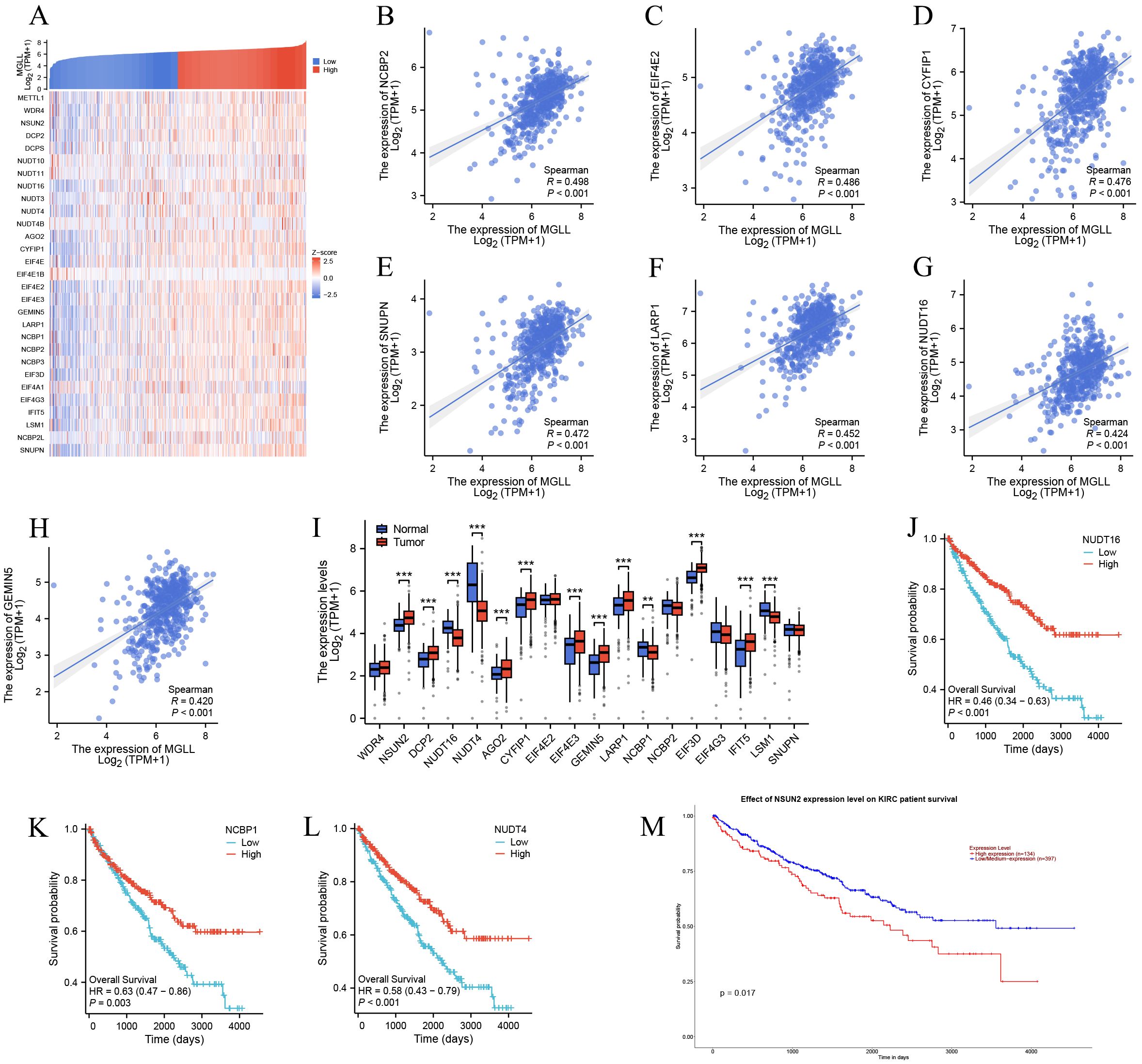 Figure 5. Association of MGLL expression with m7G methylation-related genes in ccRCC. (A) TCGA ccRCC cohort analyzed the association between MGLL and the expression of 29 m7G-related genes. (B-H) The scatter plot showing the correlation between MGLL and the expression of m7G-related genes including NCBP2, EIF4E2, CYFIP1, SNUPN, LARP1, NUDT16 and GEMIN5 in ccRCC. (I) The expression levels of 18 m7G-related genes (with a correlation coefficient r > 0.3) associated with MGLL in ccRCC (n = 537) and normal tissues (n = 72). (J-M) The survival curve analysis of NUDT16, NCBP1, NUDT4 and NSUN2 in ccRCC. **p < 0.01; ***p < 0.001.