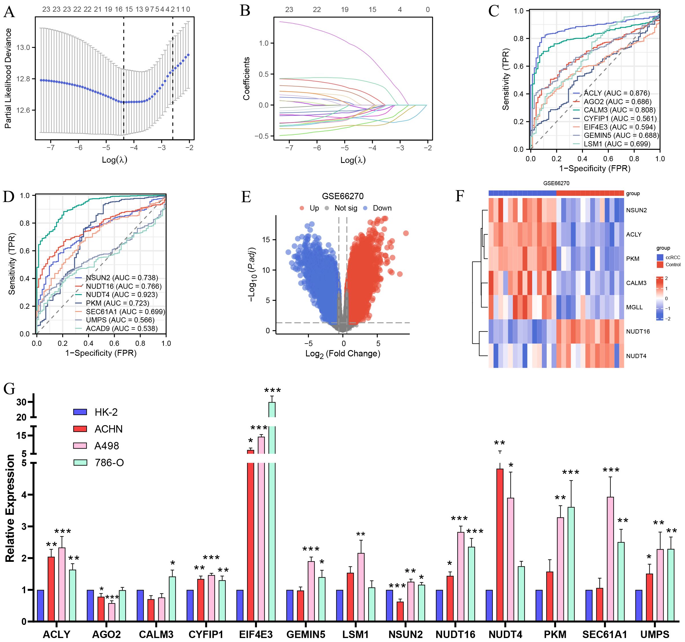 Figure 6. Validation of the GEO database, screening of prognostic and diagnostic biomarkers for MGLL-related genes, and qPCR experimental detection. (A, B) Prognostic LASSO coefficient screening and variable trajectory analysis for 23 MGLL-related genes (including MCODE analysis of PPI network and m7G-related genes). (C, D) ROC curve for diagnosis of MGLL-related genes (14 genes selected by prognostic LASSO coefficient) in ccRCC. (E) Volcano plots of differentially expressed genes in the dataset of ccRCC and normal tissues (GSE66270) (|logFC| > 0.58, p.adj < 0.05). (F) Heatmap of the expression of 7 prognostic and diagnostic-related genes shown in the GSE66270 dataset. (G) qRT-PCR experiment assay for the expression of the genes screened by the LASSO regression coefficient for prognosis in normal renal tubular epithelial cells HK-2 and ccRCC cell lines ACHN, A498 and 786-O. *p < 0.05; **p < 0.01; ***p < 0.001.