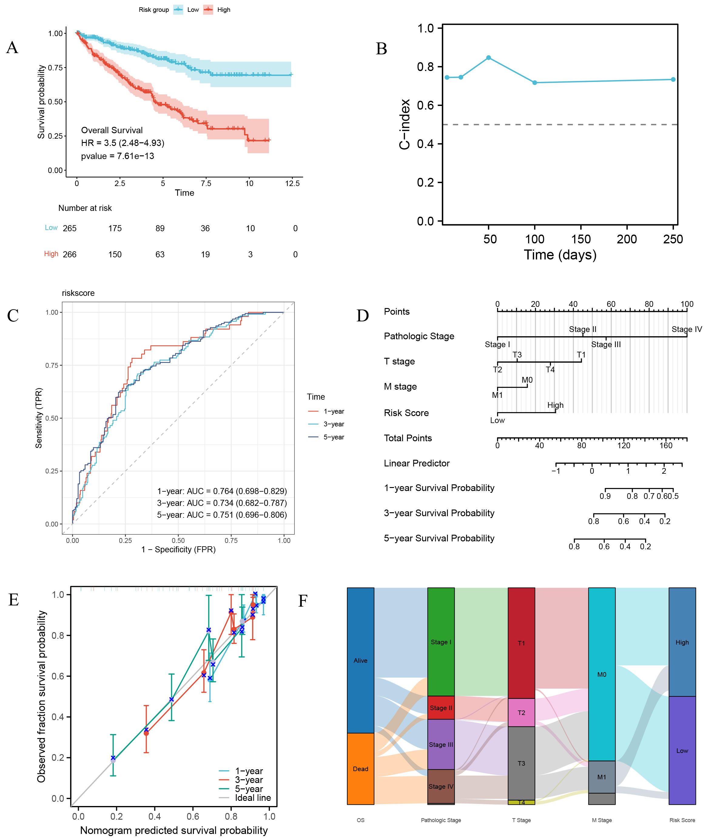 Figure 7. Prognostic risk characteristics and evaluation. (A) Survival curves of high-risk and low-risk group patients. (B) Time-dependent C-index plot of the risk model. (C) Time-dependent ROC curve of the risk model. (D) Prognostic nomogram combining risk scores and major clinical pathological variables. (E) Prognostic calibration curve. (F) Sankey diagram of clinical pathological features.