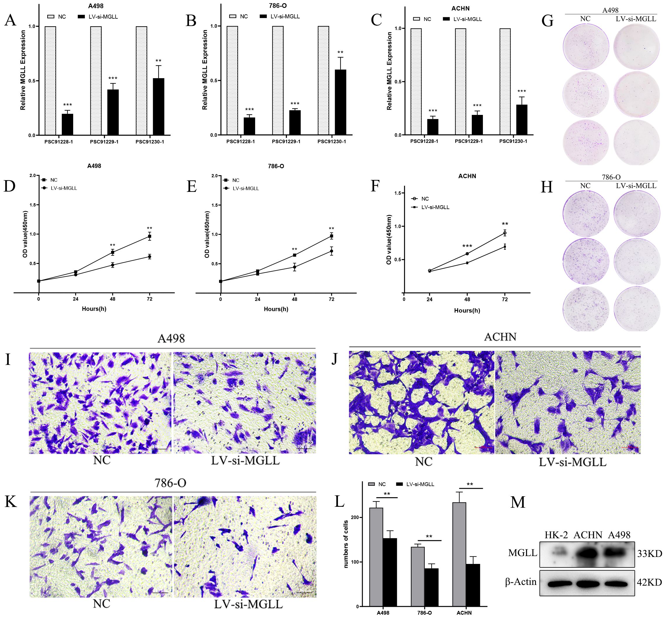 Figure 8. Knockdown of MGLL expression inhibits the proliferation, colony formation, and migration abilities of ccRCC cells. (A-C) The knockdown efficiency of three LV-RNAi sequences on MGLL gene expression in A498, 786-O and ACHN cell lines was detected using qRT-PCR. (D-F) CCK-8 assay to determine the proliferation levels of A498, 786-O and ACHN cells. (G, H) Determination of colony formation experiments in A498 and 786-O cells. (I-L) Transwell assay to determine the migration ability of A498, ACHN and 786-O cells (Scale bar, 100 μm). (M) Immunoblot assay of MGLL protein expression in normal renal tubular epithelial cells (HK-2) and ccRCC cell lines (ACHN and A498). **p < 0.01; ***p < 0.001.