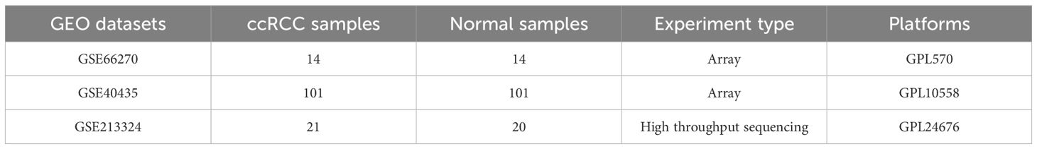 The mRNA expression data and clinical information were downloaded from The Cancer Genome Atlas (TCGA) database (https://www.cancer.gov/ccg/research/genome-sequencing/tcga) and Genotype-Tissue Expression (GTEx) database (15). The TCGA database includes ccRCC tissues from 531 patients and adjacent normal tissues from 72 cases, while the GTEx database includes RNAseq data from 28 normal tissues (16). The extracted data is presented in Transcripts Per Million (TPM) format. The proteomics data and immunohistochemical staining slides are derived from the Clinical Proteomic Tumor Analysis Consortium (CPTAC) database (17) and The Human Protein Atlas (HPA) database (https://www.proteinatlas.org/) (18). The gene amplification and mutation status of MGLL was obtained from the cBioPortal (http://www.cbioportal.org/) for Cancer Genomics (19). The GEPIA database (http://gepia.cancer-pku.cn/) (20), the UALCAN database (https://ualcan.path.uab.edu/index.html) (21) and the TCGA database were utilized for Kaplan-Meier survival curve analysis. The three independent validation datasets, comprising comprehensive gene expression profiles of both ccRCC and matched normal control samples, were systematically retrieved from the Gene Expression Omnibus (GEO) database (https://www.ncbi.nlm.nih.gov/geo/). The GSE66270 dataset contains mRNA microarray expression analysis data from 28 pairs of matched malignant and non-malignant kidney tissue samples from 14 ccRCC patients without diagnosed metastasis (22). The GSE40435 dataset comprises comprehensive whole-genome expression profiles derived from 101 paired samples of ccRCC tumors and their corresponding adjacent non-tumor kidney tissues (23). Additionally, the GSE213324 dataset contains high-throughput sequencing data obtained from 21 RCC samples and 20 normal kidney tissue specimens (24). Detailed information regarding these datasets is presented in Table 1.