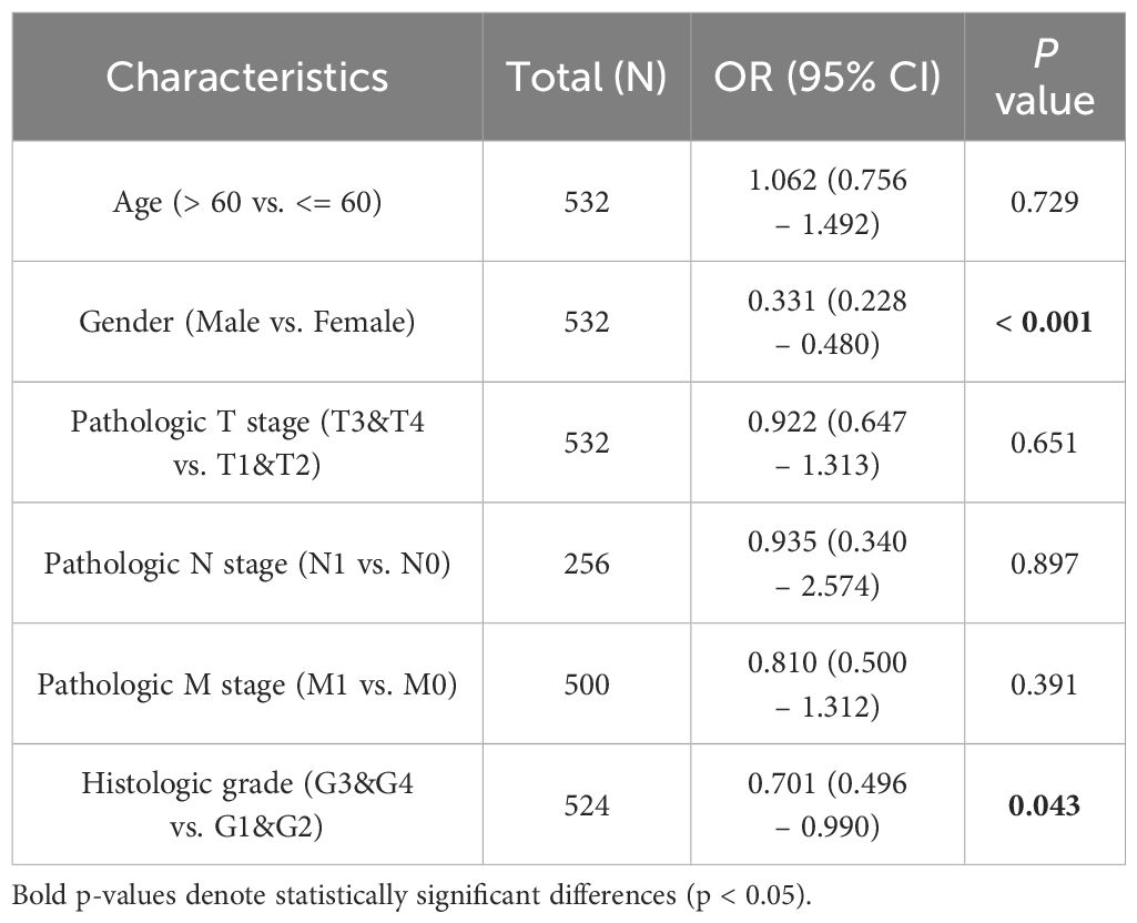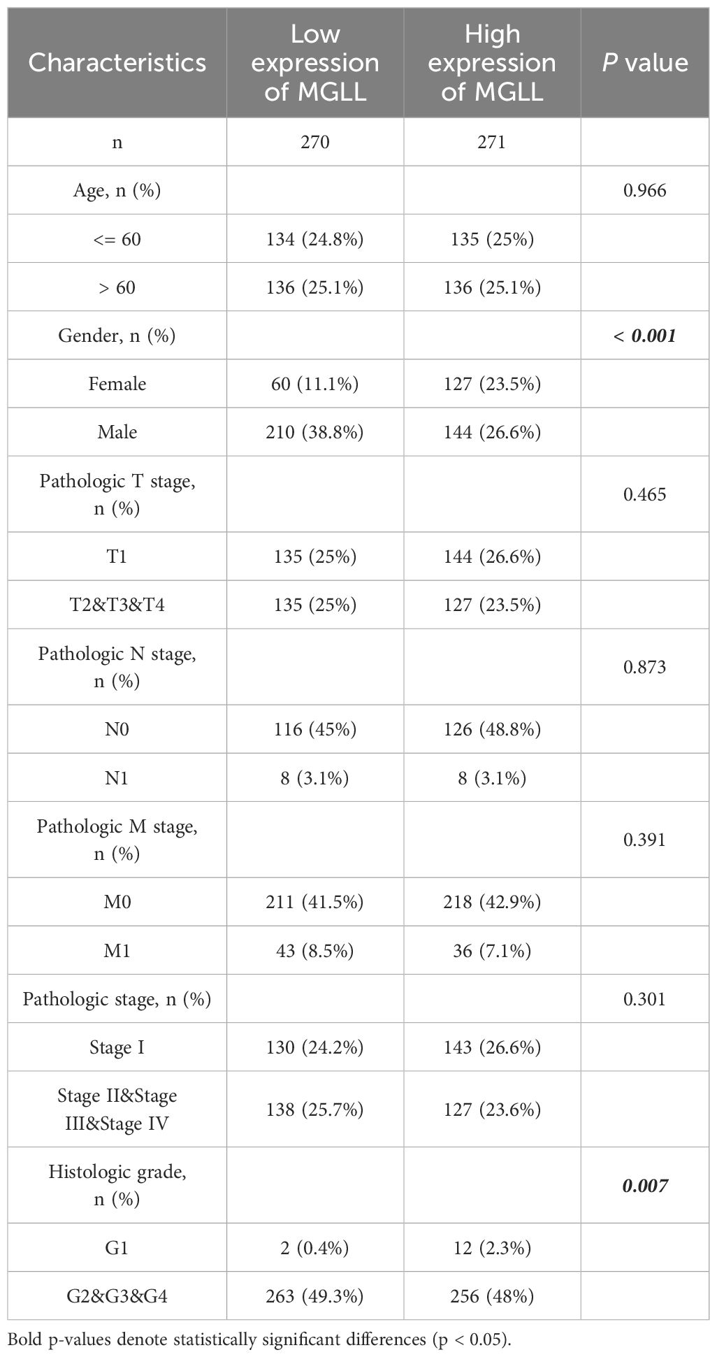 The baseline data of ccRCC patients from the TCGA database were statistically analyzed (Table 2). The data was divided into two groups: 270 ccRCC patients with low MGLL expression and 271 with high MGLL expression. Significant differences were observed between the two groups in histologic grade (p = 0.007) and gender (p < 0.001). No significant differences were found in TNM staging and age. Logistic regression analysis was conducted to examine the correlation between MGLL expression and the clinical pathological features of ccRCC (Table 3). Similar to the baseline statistics, the logistic regression analysis showed differences between the two groups in terms of the histologic grade (p = 0.043) and gender (p < 0.001).