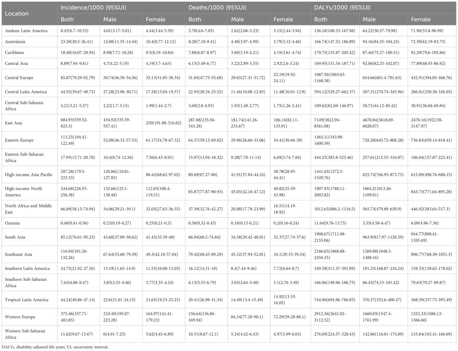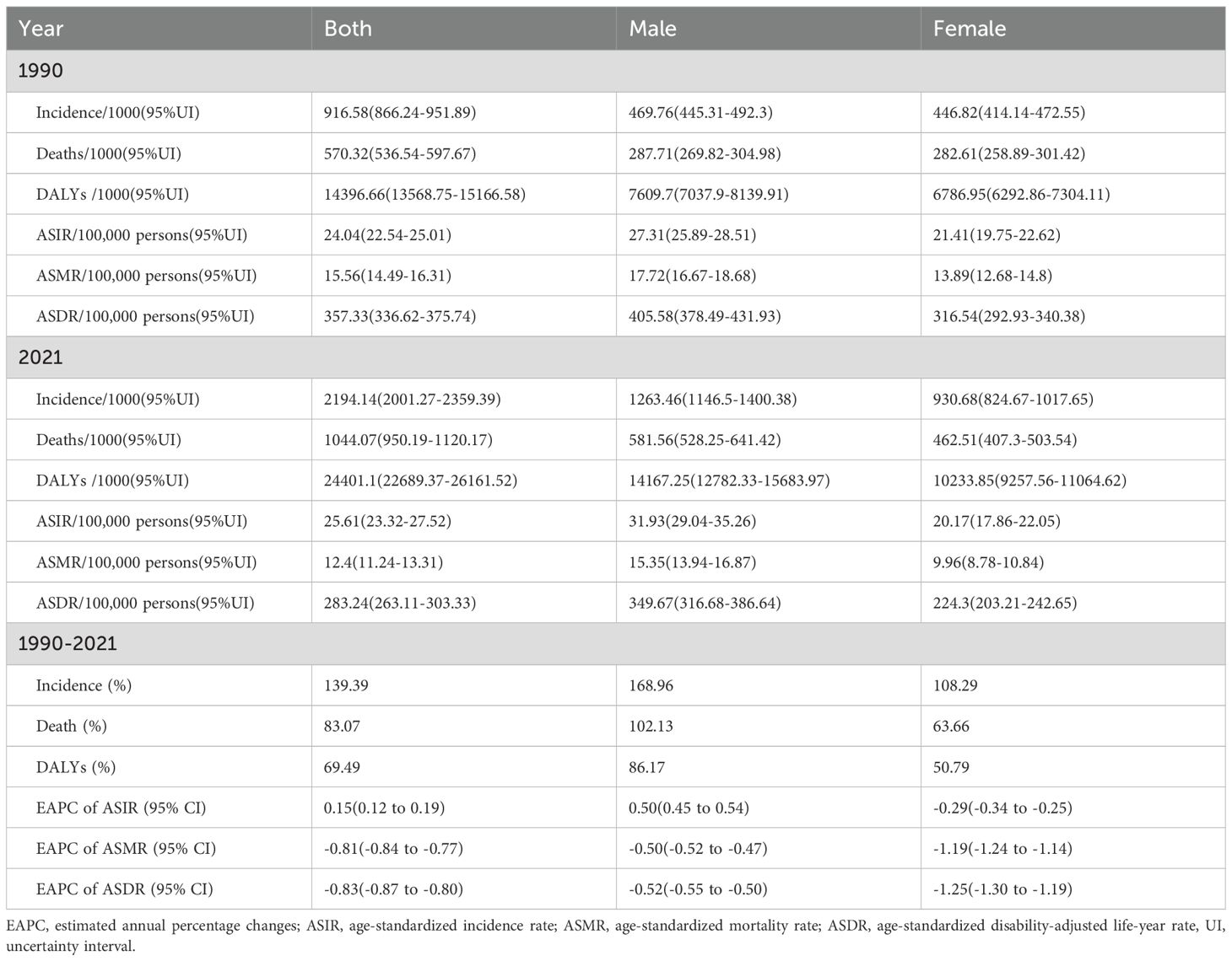 GBD 2021 utilizes the latest epidemiological data and refined standardized methodologies to conduct a comprehensive assessment of over 370 diseases and injuries, as well as 88 risk factors, by age and gender across 204 countries and territories. It offers detailed insights into incidence, mortality, disability-adjusted life years (DALYs), and age-standardized rates (ASRs) (12, 13). All data were meticulously sourced from reputable public databases, having undergone rigorous screening and quality control procedures to ensure their reliability and accuracy. Through meticulous data cleaning, transformation, and modelling of datasets obtained from research institutions worldwide, the GBD collaborator network has generated comprehensive estimates for a wide range of health indicators. All data are accessible via the GBD Results Tool (https://vizhub.healthdata.org/gbd-results/).