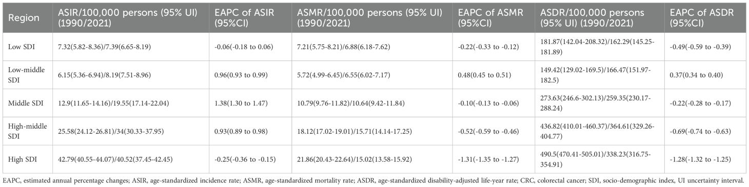 Interpretation: CRC burden varies by gender, age, and region. While some regions show declining mortality, overall burden remains substantial, especially in middle/low-middle SDI areas. Notably, even high-SDI countries exhibit significant gaps in CRC management. Targeted public health strategies—optimizing prevention, early detection, and resource allocation—are critical to address rising incidence and disparities.