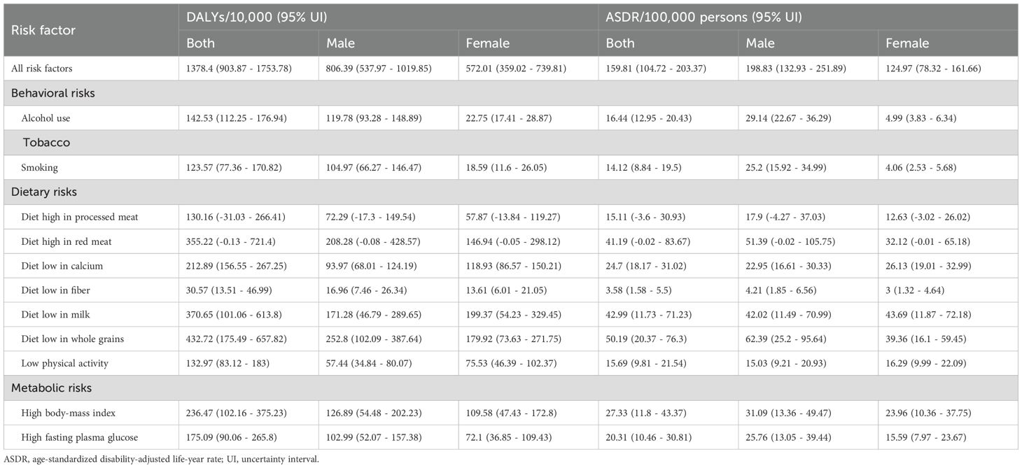 In 2021, the DALYs attributable to all risk factors for CRC amounted to 1378.40×104 (95% UI: 903.87×104- 1753.78×104) (Table 4). Across all genders, the primary risk factors for CRC were diet low in whole grains, diet low in milk, and diet high in red meat. Compared to other behavioral and metabolic risks, dietary risks emerged as the leading risk factor for CRC(Supplementary Table S8). Diet low in whole grains was identified as the predominant risk factor contributing to CRC-related disability and mortality.