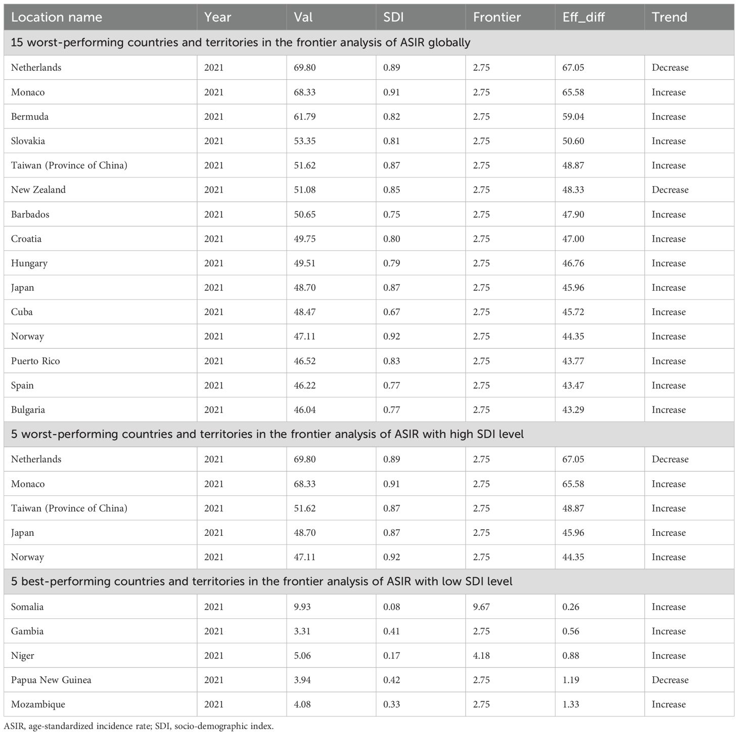 We used data on ASIR, ASDR, ASMR and SDI between 1990 and 2021 to calculate the effective difference from the frontier for each country and territory. The results of the frontier analysis are visualized in Figures 9A, C, E. The black line represents the lowest achievable ASR value for each country or territory at the current SDI level. The distance between each point and the black line indicates the potential for future reductions in disease burden, with greater distances signifying greater potential. Across the six plots, the scatter points form an inverted triangle, with lower values on the left and higher values on the right. As SDI increases, the range of point distribution also expands, suggesting that countries with higher SDI levels may have greater potential for reducing ASR. Figures 9B, D, F identify the 15 worst-performing countries globally, the five best-performing countries with low SDI level, and the five worst-performing countries with high SDI level. Detailed results of the analysis are presented in the Table 5, Supplementary Tables S9, S10 (Figure 9) (Table 5) (Supplementary Tables S9, S10).
