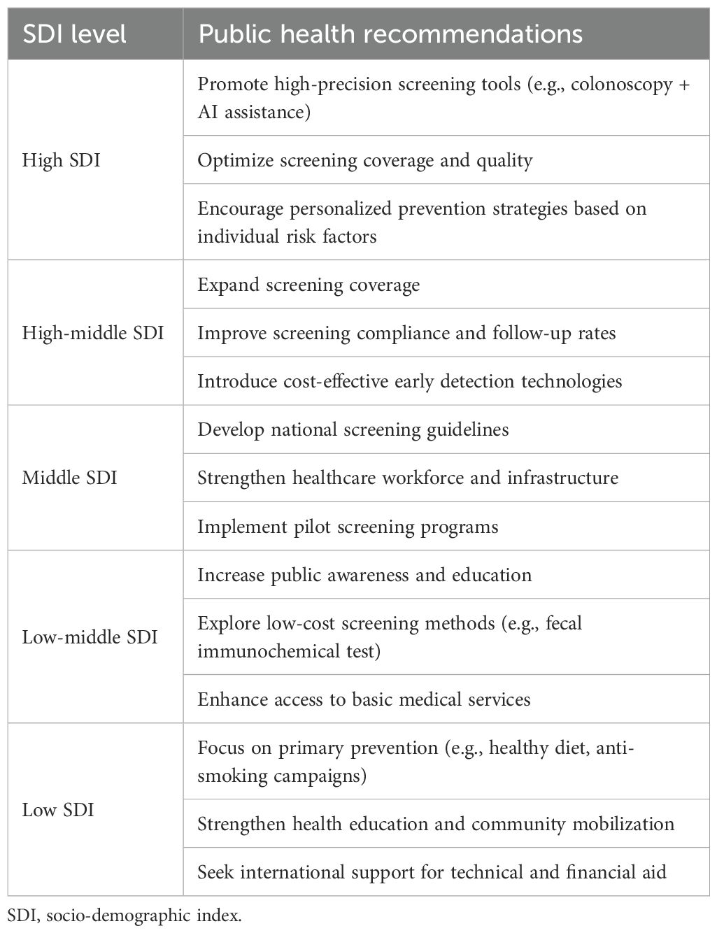 Nowadays, economically developed countries and territories generally recommend routine CRC screening for high-risk age groups (50–75 years) to facilitate early diagnosis and treatment, which is one of the most effective measures for reducing mortality and DALYs (43, 56). Since the 1990s, the United States has actively promoted CRC screening by establishing multidisciplinary expert panels to regularly update and evaluate screening guidelines (57–59). In addition, federal and state-level policies have supported the inclusion of screening services in health insurance coverage, thereby lowering barriers to screening. The Colorectal Cancer Control Program (CRCCP), led by the Centers for Disease Control and Prevention (CDC), has provided screening services for low-income and uninsured populations, effectively increasing screening rates (60). Since 2005, Austria has included fecal occult blood testing (FOBT) in its universal health insurance program and has gradually expanded colonoscopy screening over subsequent years. The establishment of a nationwide electronic health record system has further improved the organization and continuity of these screening programs (61). The experience of Austria and other European countries with established screening programs, such as the Czech Republic and Germany, demonstrates a marked reduction in incidence and mortality (62). These measures all contribute to reducing the disease burden caused by CRC and improving the health level of the public.