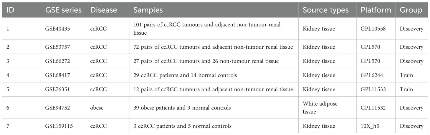 We systematically analyzed six publicly available GEO datasets encompassing clear cell renal cell carcinoma (ccRCC) and obesity-related transcriptomic profiles (10). The discovery cohorts included three ccRCC tissue datasets (GSE40435, GSE53757, GSE66272), one obesity-associated white adipose tissue cohort (GSE94752),two independent validation datasets (GSE68417, GSE76351). All datasets met stringent inclusion criteria: histopathological confirmation, availability of raw expression matrices (RNA-seq/microarray), and minimum sample sizes exceeding biological triplicates (11). Detailed dataset characteristics are presented in Table 1.