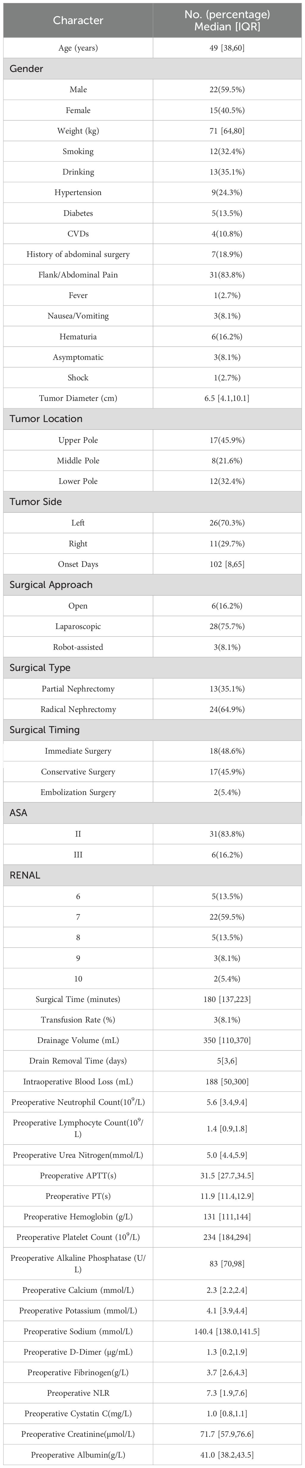 This retrospective, single-center study analyzed data from 165 patients with spontaneous renal tumor rupture treated at a tertiary hospital between April 2014 and June 2024. Following screening, 37 patients who were postoperatively diagnosed with RCC were included in the final cohort. The inclusion criteria were as follows: ① preoperative imaging or intraoperative findings consistent with spontaneous renal tumor rupture. Specifically: (a) Imaging features included perirenal hematoma, contrast extravasation, or signs of renal capsule disruption on CT; (b) Intraoperative findings included visible rupture of tumor integrity, leakage of tumor contents into the perirenal space, or active bleeding with renal capsule laceration; ② postoperative pathological confirmation of RCC; ③ postoperative follow-up included computed tomography (CT) or other imaging studies to assess for recurrence or metastasis. The exclusion criteria were as follows: ① renal hemorrhage resulting from trauma or iatrogenic factors; ② preexisting renal conditions or a known history of tumor metastasis; ③ postoperative diagnosis of non-RCC renal lesions; and④ incomplete clinical data.