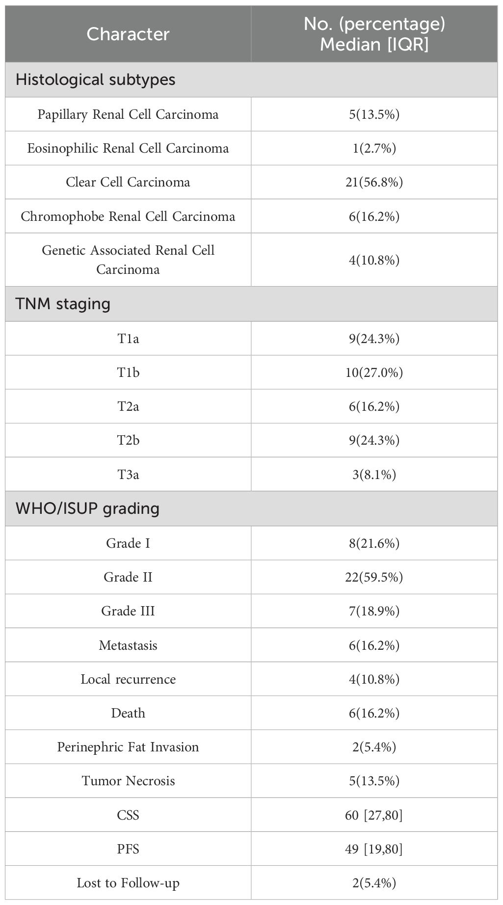 Over a median follow-up of 60 months (IQR: 27–80), 6 patients (16.2%) died from RCC, and 10 patients (27%) experienced disease progression, including local progression or distant metastasis. The median CSS and PFS were 60 months (IQR: 27–80) and 49 months (IQR: 19–80), respectively. Two patients (5.4%) were lost to follow-up. Postoperative management, such as systemic anticancer therapy, was reserved for patients with recurrence or metastasis. A detailed summary of the pathological findings and clinical outcomes is presented in Table 2.