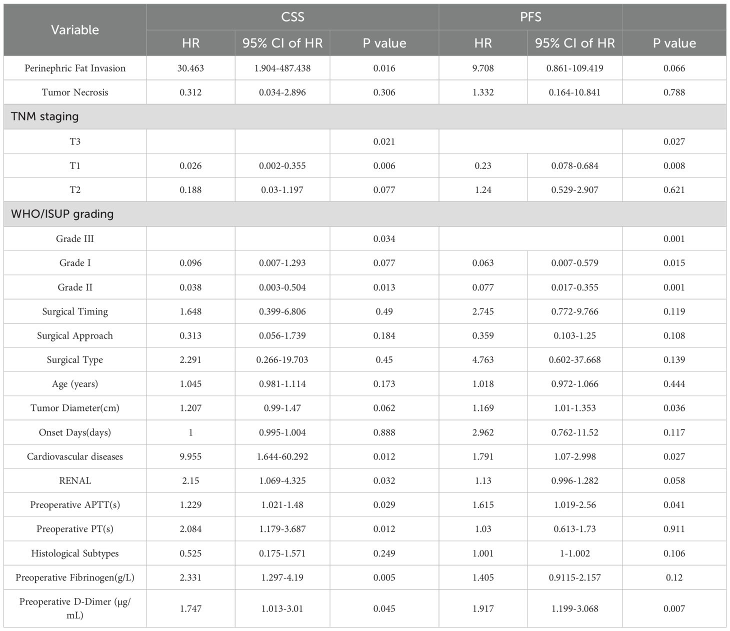 Univariate Cox regression analysis further revealed that TNM stage, WHO/ISUP grade, cardiovascular diseases, PT, APTT, RENAL score, perinephric fat invasion, D-dimer, and fibrinogen were significantly associated with CSS. Prognostic factors significantly associated with PFS included TNM stage, WHO/ISUP grade, tumor size, cardiovascular diseases, and coagulation abnormalities (Table 3).