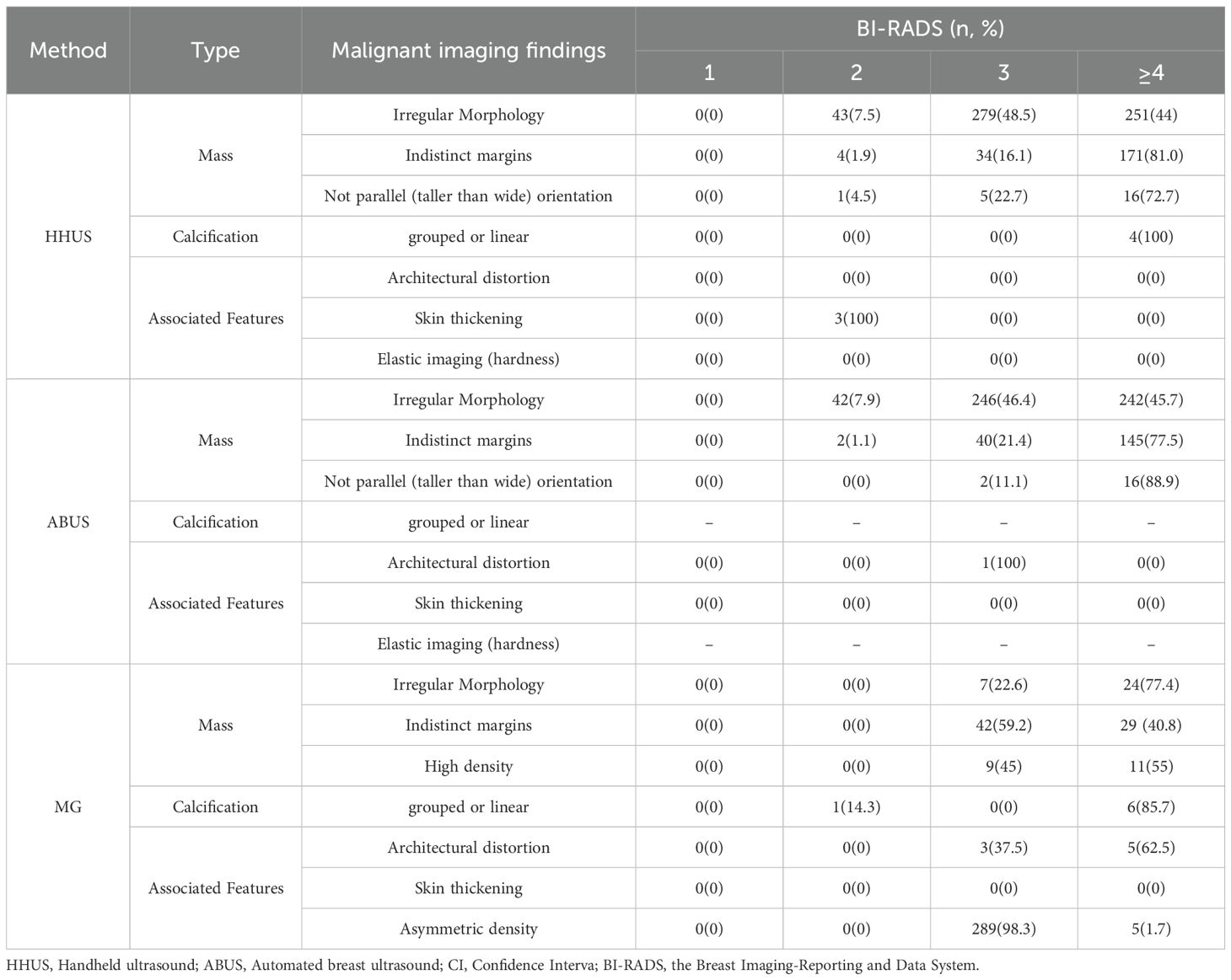 Table 1 delineates the distribution of malignant imaging findings across the BI-RADS categories in HHUS, ABUS and MG. A minority of mass-related malignant signs were BI-RADS category 2 in both HHUS (48 women) and ABUS (44 women), while the majority were BI-RADS category 3 (318 for HHUS and 288 for ABUS) or BI-RADS category 4 or higher (438 for HHUS and 403 for ABUS). Notably, among mass-related malignant signs, indistinct margins and not parallel (taller than wide) orientation showed a high proportion of lesions being classified as BI-RADS category 4 or higher (81% and 72.7% in HHUS, 77.5% and 88.9% in ABUS, respectively). MG less frequently identified mass-related malignant signs, such as 31 for irregular morphology and 71 for indistinct margins, compared to HHUS (573 vs. 209) and ABUS (530 vs. 187). However, MG detected more calcification than HHUS (7 vs. 4). Among individuals with calcification, 100% were BI-RADS category 4 or higher for HHUS, whereas 85.7% for MG. Meanwhile, all eight individuals with architectural distortion detected by MG were BI-RADS category 3 or higher, of whom 62.5% were BI-RADS category 4 or higher. This diagnostic pattern is similar to that of the characteristics observed with calcifications, indicates that both architectural distortion and calcifications are strong indicators of malignancy for radiologists. Asymmetric density in MG was largely concentrated in BI-RADS category 3 (98.3%).