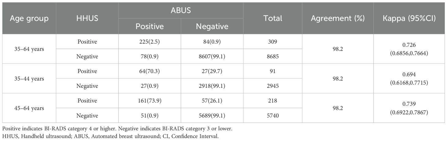 The agreement on BI-RADS classifications of category 4 or higher between HHUS and ABUS was 98.2%, with a Kappa coefficient of 0.726, indicative of a substantial agreement between the two imaging modalities. When stratified by age groups, the agreement for both 35–44 and 45–64 subgroups was found to be 98.2%. This suggests no significant variation in consistency between the two ultrasound techniques across different age groups (Table 2).