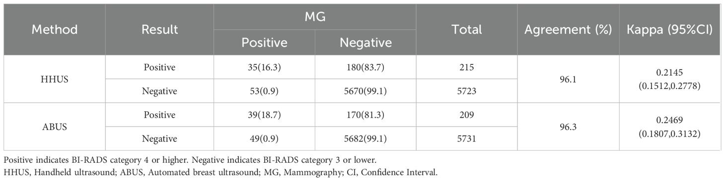The study demonstrated a high diagnostic consistency between HHUS and ABUS, indicating that ABUS can be effectively utilized for BI-RADS classification like HHUS. However, when comparing HHUS and ABUS to MG, the consistency was lower with 96.1% and 96.3% respectively. Discrepancies predominantly manifested as a higher proportion of cases (77.3% for HHUS and 77.6% for ABUS) where both HHUS and ABUS detected abnormalities while MG did not, as opposed to fewer instances (22.7% for HHUS and 22.4% for ABUS) where ultrasound flagged as negative while MG flagged as positive. The differences may be due to the varying abilities of ultrasound and MG to detect different types of malignancy-related pathological features observed in this study. Ultrasound may be more effective in identifying mass-related signs, while MG may be more excellent at detecting calcifications and architectural distortions. The reason why MG detects fewer mass-related signs compared to ultrasound may be related to the high-density glandular tissue that can obscure isodense lesions, while ultrasound is not affected by such tissue density (37). Our findings align with those of previous studies, which indicate that MG identifies fewer mass-related malignancies compared to ultrasound but detects a higher prevalence of malignancies associated with calcifications and architectural distortions (38–41), which highlights the complementary nature of ultrasound and MG in breast cancer screening.
