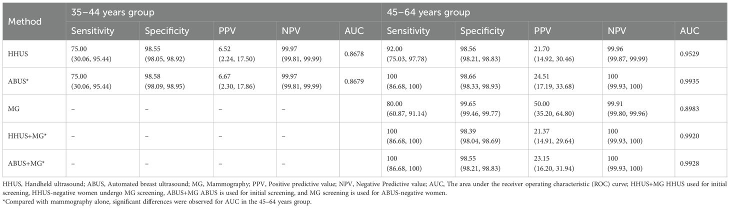 This study also evaluated the performance of BI-RADS classification system in breast cancer screening, highlighting notable differences across age groups and screening methods. In the screening program for individuals aged 35-44, both HHUS and ABUS showed similar diagnostic performance, with sensitivities of 75% and specificities of 98.55% and 98.58%, respectively. For individuals aged 45-64, ABUS showed slightly higher sensitivity (100% vs 92%) and specificity (98.66% vs 98.56%). This aligns with a similar finding in a previous study that ABUS has statistically significant higher diagnostic accuracy than HHUS in detecting breast cancer (42). This difference may be attributed to ABUS providing volume and more comprehensive breast imaging, thereby enhancing the detection rate of lesions (43). When using MG as a supplementary examination to the ultrasound-negative women, the BI-RADS classification system can increase the sensitivity from 92% to 100% in the 45–64 age group, underscoring the benefits of a comprehensive screening approach. However, a minor decrease in specificity may result in an increase in false-positive results, imposing a psychological burden on patients and increasing the cost of follow-up examinations. Despite achieving a sensitivity of 100% when used alone, ABUS showed a decrease in AUC if using MG as a supplementary examination, suggesting that adding additional screening methods may not confer additional benefits to ABUS (44).