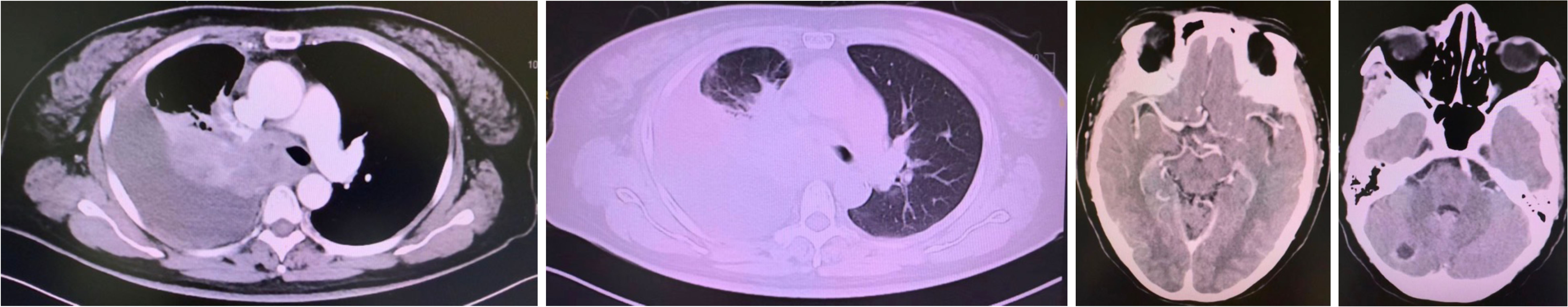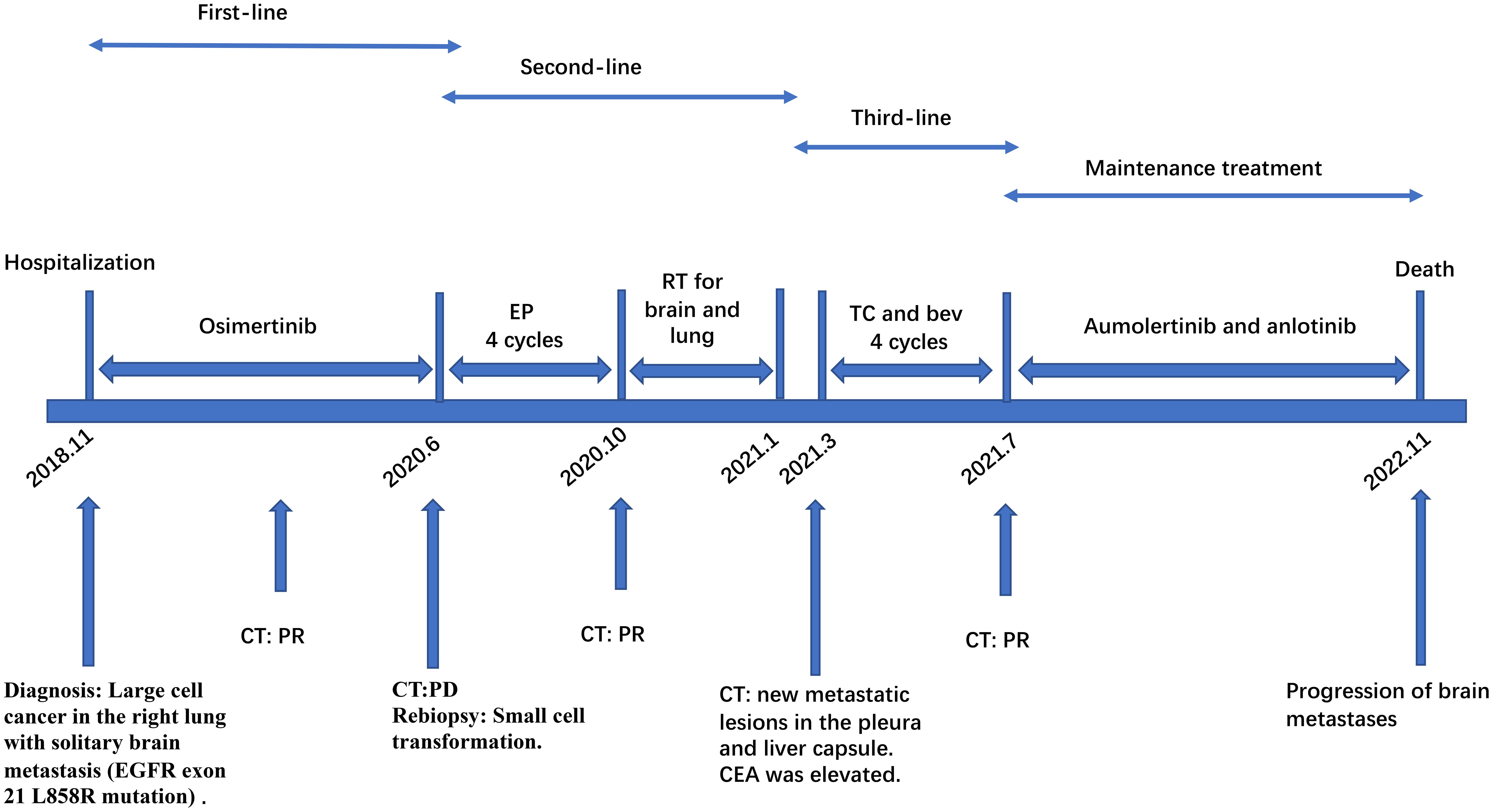 A CT-guided biopsy revealed transformation to small-cell lung cancer with maintained neuroendocrine marker expression. Second-line therapy with etoposide (100 mg/m² days 1-3) and cisplatin (75 mg/m² day 1) was administered for four cycles (9). CT scans showed that the lung lesions had significantly shrunk. (Figure 2) The patient subsequently received consolidative radiotherapy: whole-brain radiotherapy (39 Gy in 13 fractions) followed by intensity-modulated radiotherapy to the primary lung tumor (45 Gy in 30 fractions) (10, 11). Histological analysis from a re-biopsy of the progressive chest lesion revealed small cell cancer transformation and tested positive for neuroendocrine markers, including synaptophysin, chromogranin A, and CD56. Tissue and blood samples were subjected to next-generation sequencing (NGS), which revealed an EGFR exon 21 L858R deletion. In March 2021, PET/CT and brain MRI revealed new metastatic lesions in the pleura and liver capsule, with an increase in multiple metastatic tumors in the brain. (Figure 3) Serum tumor markers showed elevated carcinoembryonic antigen (CEA) (8.1 ng/mL) while NSE remained normal (11.3 ng/mL). Following disease progression, a third biopsy of the chest mass was performed, but no tumor tissue was detected. Circulating tumor DNA (ctDNA) from peripheral blood revealed an EGFR exon 21 L858R deletion. We considered that the recurrent focus might be adenocarcinoma of the lung. Plasma ctDNA analysis confirmed persistence of EGFR L858R mutation without additional resistance alterations. Third-line therapy (from April 20 to July 21, 2021) with paclitaxel (200 mg/m²), carboplatin (AUC 5), and bevacizumab (15 mg/kg) was administered every three weeks (12). After four cycles, CEA decreased to 3.9 ng/mL, and CT imaging showed a partial response (Figure 4). Treatment was complicated by grade 2 epistaxis, leading to bevacizumab discontinuation. The patient was switched to maintenance therapy with aumolertinib (110 mg daily) combined with anlotinib (12 mg daily, days 1–14 every 21 days) (13, 14). Follow-up assessments at 2, 6, 10, and 14 months showed sustained clinical and radiographic stability. The patient ultimately died due to progressive brain metastases in November 2022, with an overall survival of 48 months. The course of treatment is presented in Figure 5.