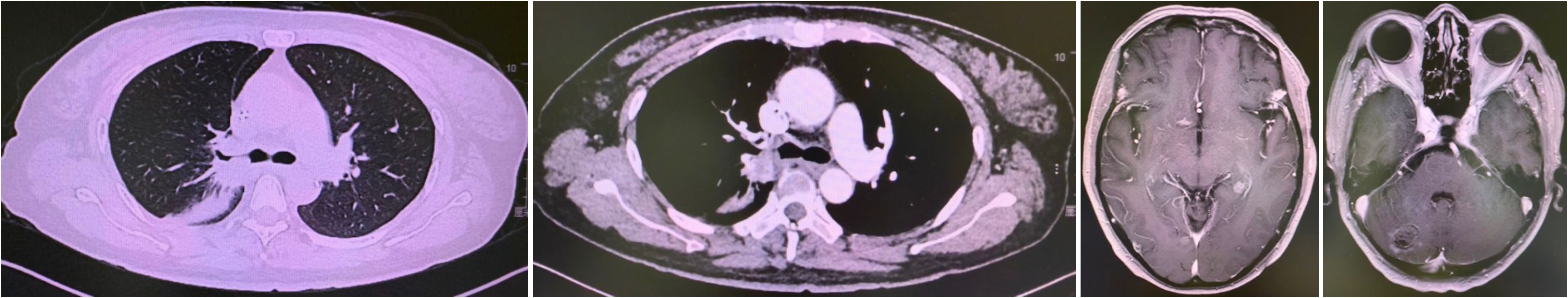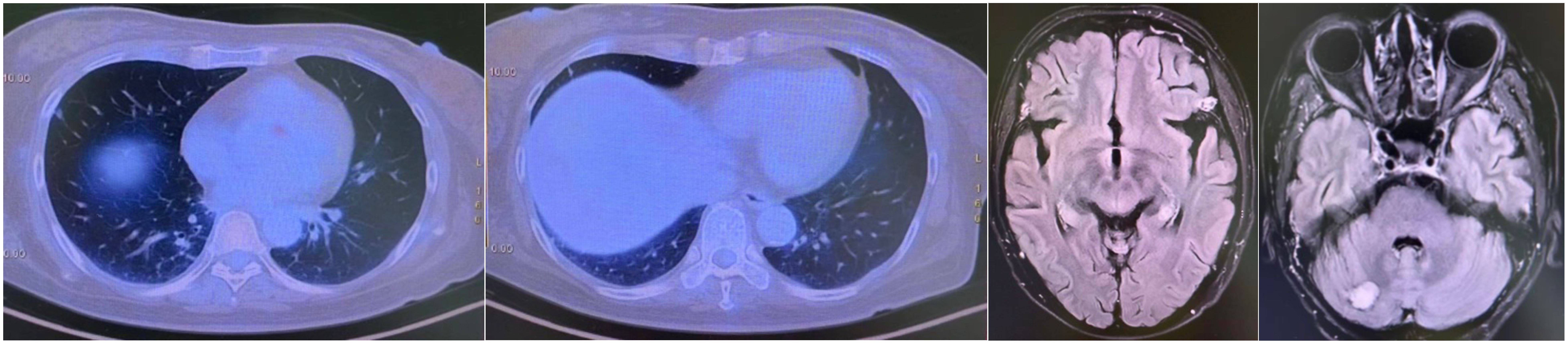 First-line therapy with osimertinib 80 mg once daily was initiated (4). After two months, restaging CT showed partial response with reduction in the lung mass to 28 mm × 25 mm. Follow-up brain MRI confirmed complete resolution of the cerebellar metastasis. The patient remained progression-free for 20 months until June 2020 when repeat imaging demonstrated disease progression (8). (Figure 1).