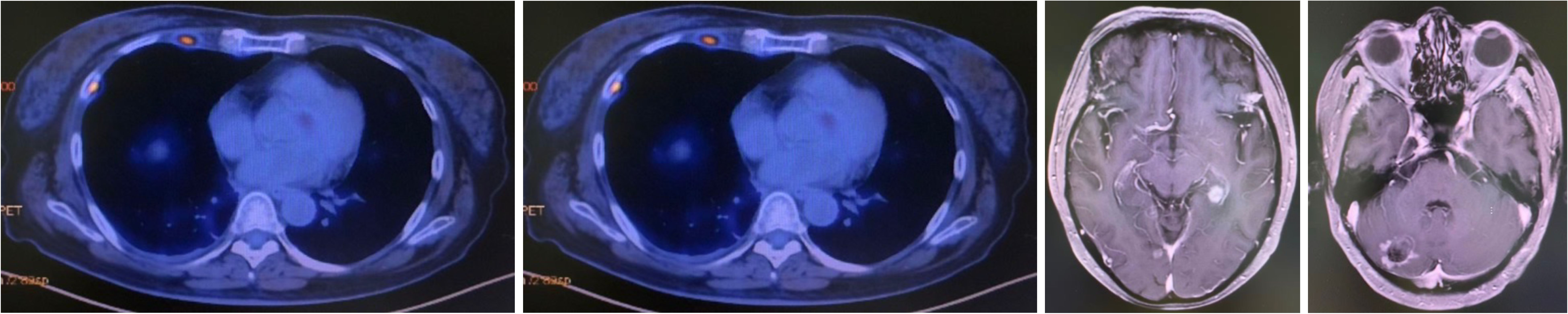 A 47-year-old female with no smoking history presented in November 2018 with an intermittent cough of three weeks’ duration. Physical examination revealed an Eastern Cooperative Oncology Group (ECOG) performance status of 1. Contrast-enhanced computed tomography (CT) of the chest showed a heterogeneously enhancing mass measuring 41 mm × 42 mm in the right upper lobe. Brain magnetic resonance imaging (MRI) revealed a solitary 15 mm × 15 mm enhancing lesion within the right cerebellar hemisphere. Histopathological examination of transbronchial biopsy specimens revealed nests and trabeculae of large polygonal cells with abundant cytoplasm, coarse chromatin, and frequent mitoses (15 per 2 mm²) (2). Immunohistochemistry showed strong positivity for synaptophysin, chromogranin A, and CD56, Molecular profiling identified an EGFR exon 21 L858R mutation (7). Thus, the diagnosis was large cell cancer in the upper lobe of the right lung with solitary brain metastasis (cT2N2M1 stage IV with EGFR exon 21 L858R mutation).