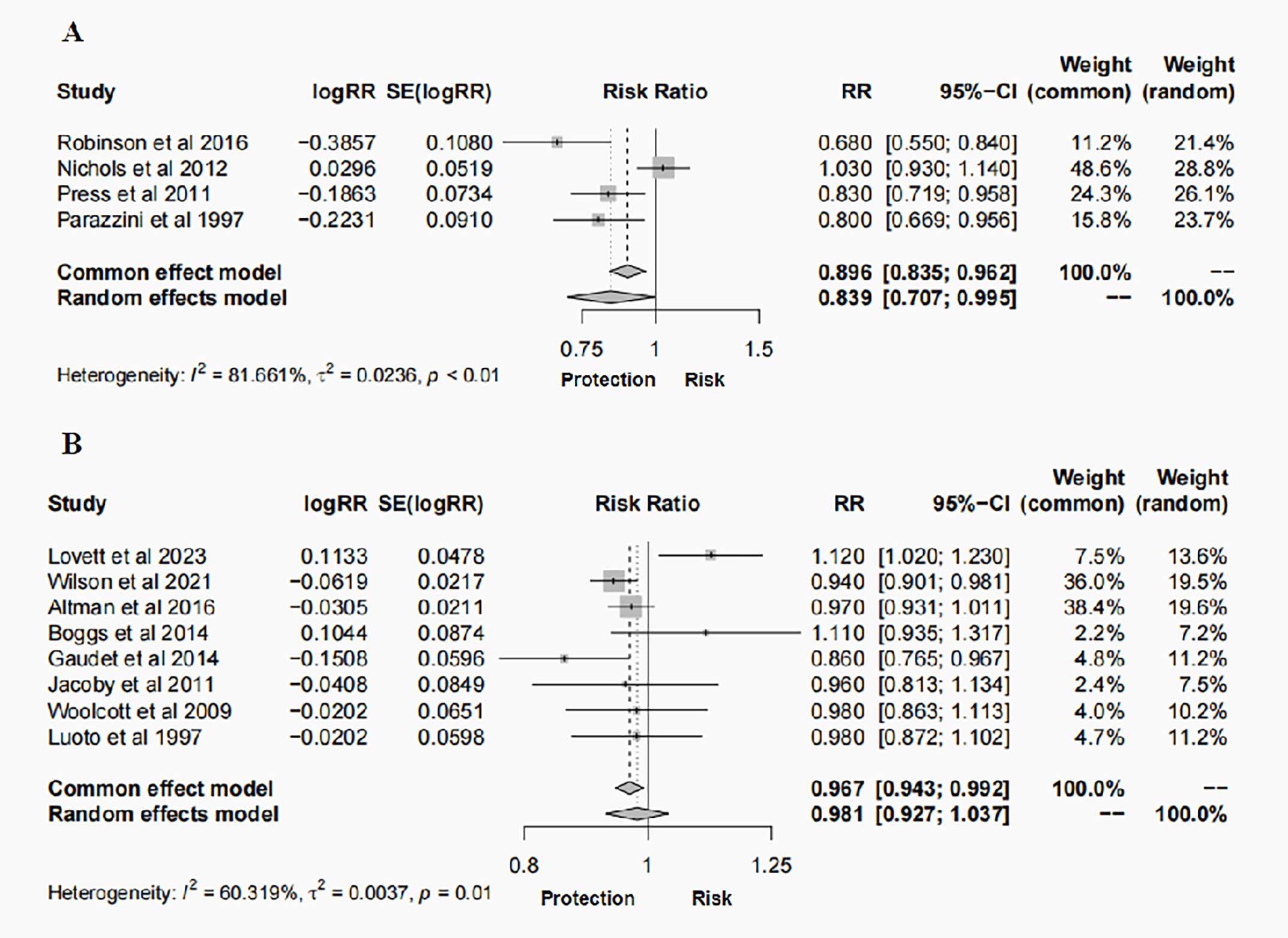 Methods: A literature search was conducted in PubMed, Embase, and the Cochrane Library from database inception up to December 11, 2024. Eligible studies were observational design. Relative ratios (RRs) and 95% confidence intervals (CIs) were pooled using a random-effects model, I2 was used to assess the heterogeneity between studies.