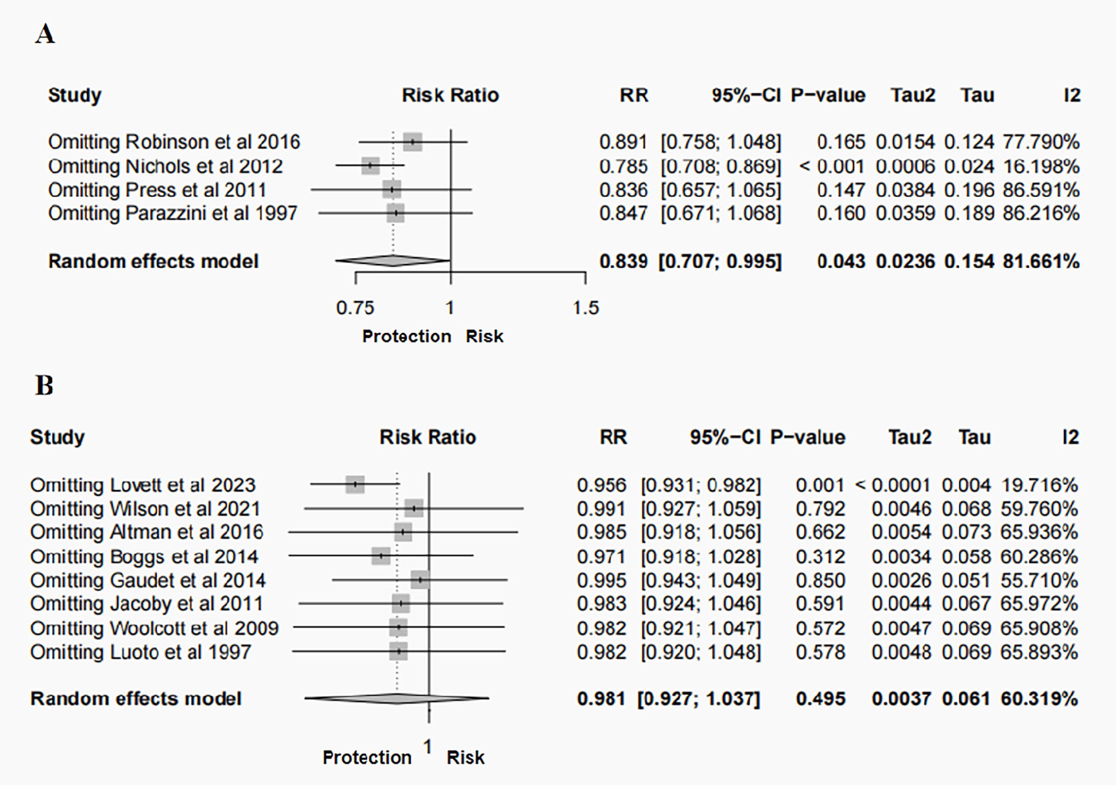 Figure 3. Sensitivity analysis of the meta-analysis for the risk of BC following hysterectomy: (A) case–control studies; (B) cohort studies.