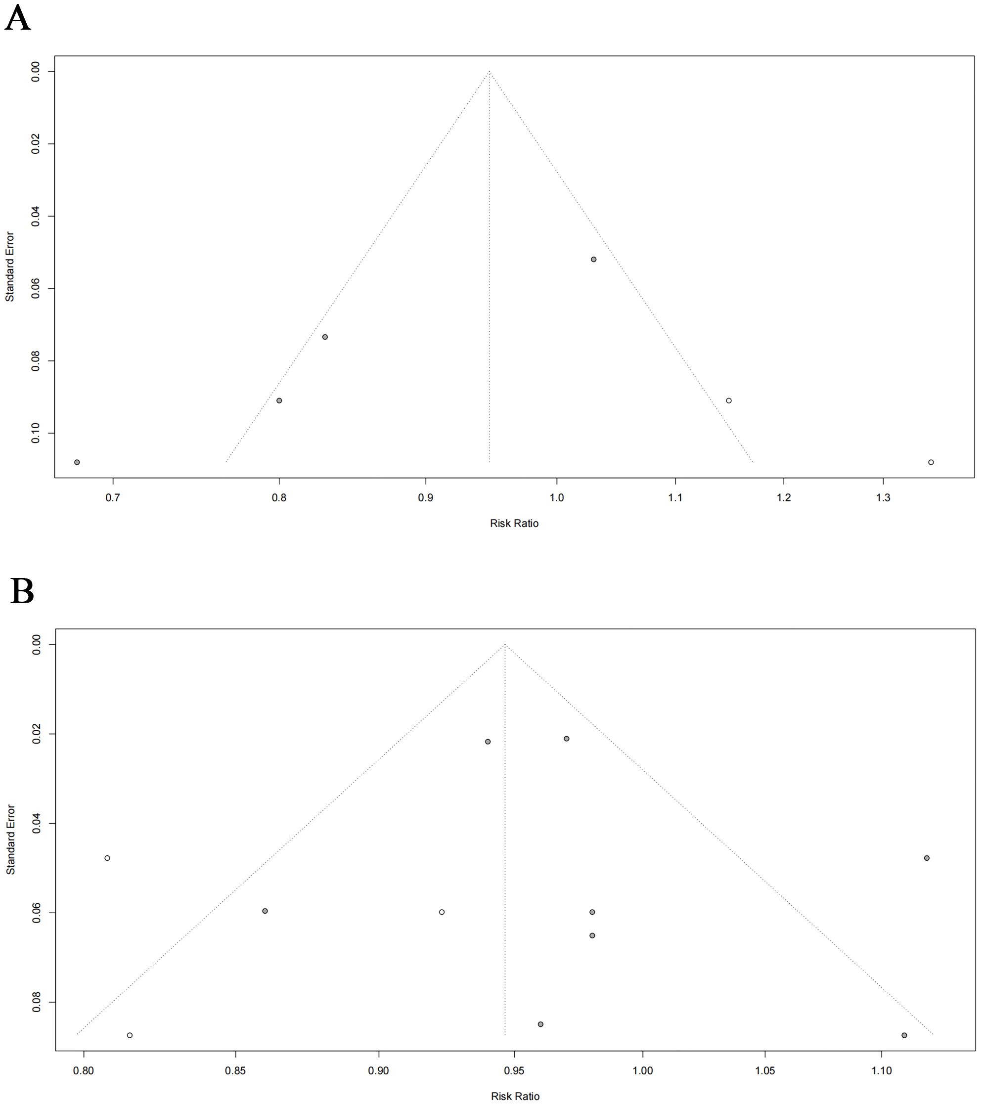 Figure 4. Egger’s funnel plots of the meta-analysis for the risk of BC following hysterectomy: (A) case–control studies ; (B) cohort studies.