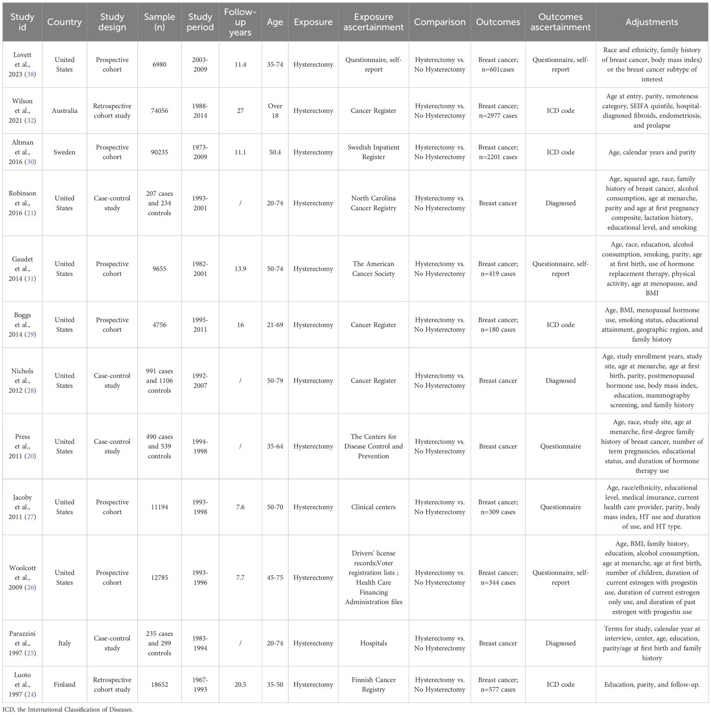 A total of 228313 participants were included in 12 studies between the years of 1997–2023.And the postoperative follow-up periods ranged from 0 to 27 years. Two studies were retrospective cohort studies (24, 32), 6 studies were prospective cohort studies (26, 27, 29–31, 38), and 4 studies were case-control studies (20, 21, 25, 28). Geographically, the majority originated from the United States (n=8), supplemented by single contributions from Australia, Sweden, Italy, and Finland. Detailed characteristics of included studies were summarized in Table 1 and Supplementary Table S3.
