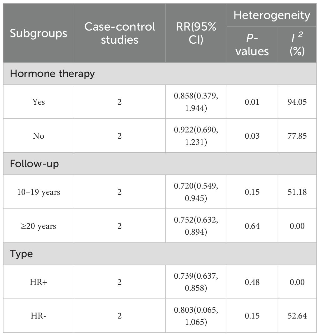 The case-control study results showed that people with more than 10 years of follow-up after hysterectomy (RR = 0.720, 95% CI: 0.549-0.945, I2 = 51.18%). When analyzed by subtype, hysterectomy was specifically associated with a reduced incidence of HR+ BC (RR = 0.739, 95% CI: 0.637-0.858, I² = 0.00%),which was consistent with the overall summary analysis. However, no association was observed between hysterectomy and the incidence of HR- BC. The results of subgroup analysis are presented in Table 2.