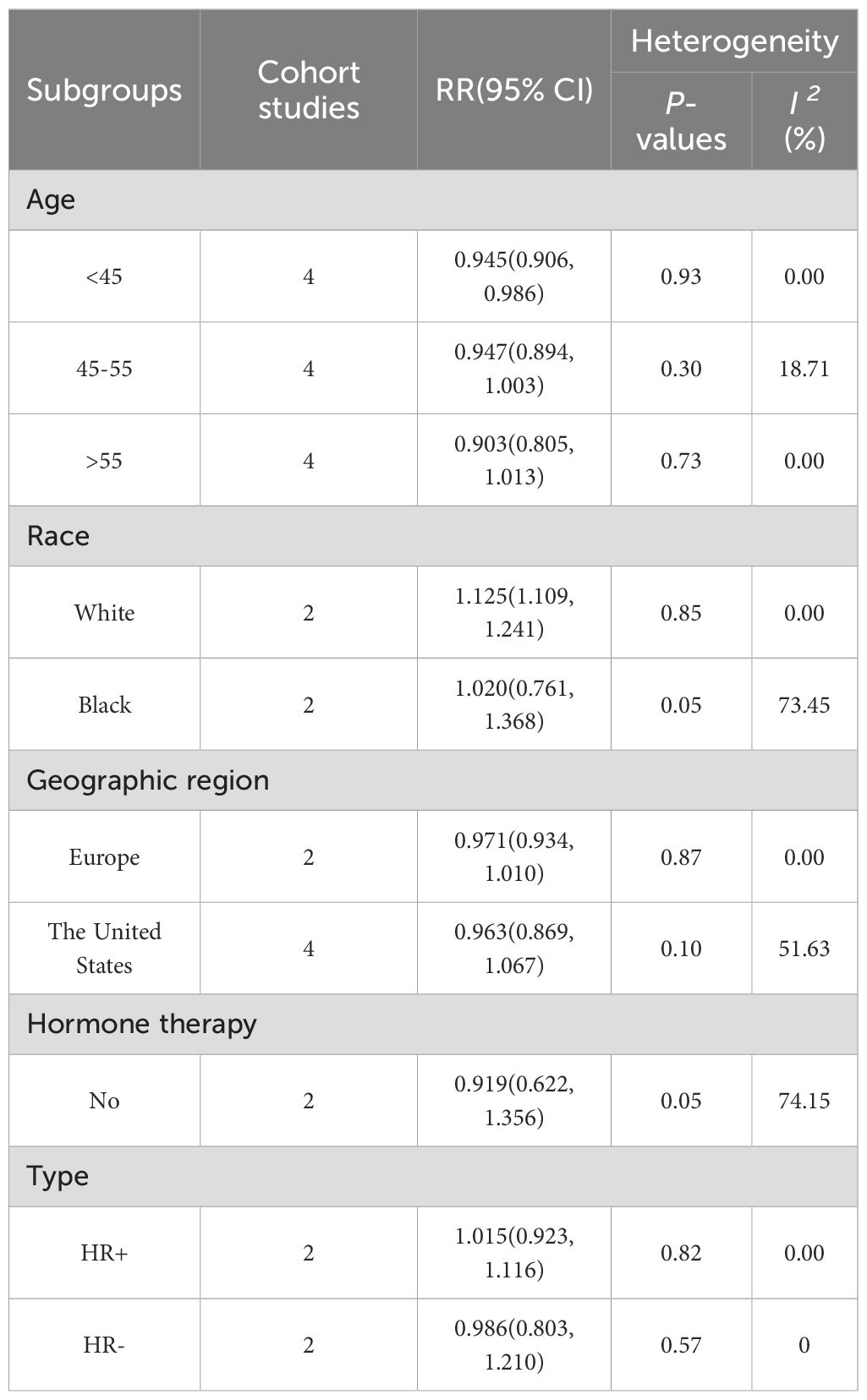 The cohort study results showed a lower risk of BC in those undergoing hysterectomy before the age of 45 (RR = 0.945, 95% CI: 0.906-0.986, I2 = 0.00%), while subgroup analyses of ethnicity showed a higher risk of BC after hysterectomy in whites (RR = 1.125, 95% CI: 1.109-1.241, I2 = 0.00%). No association was observed between the risk of BC among people who underwent surgery after age 45, black people, different geographical areas, and no postoperative hormone therapy. The results of subgroup analysis are presented in Table 3 and Supplementary Figures 1-6.