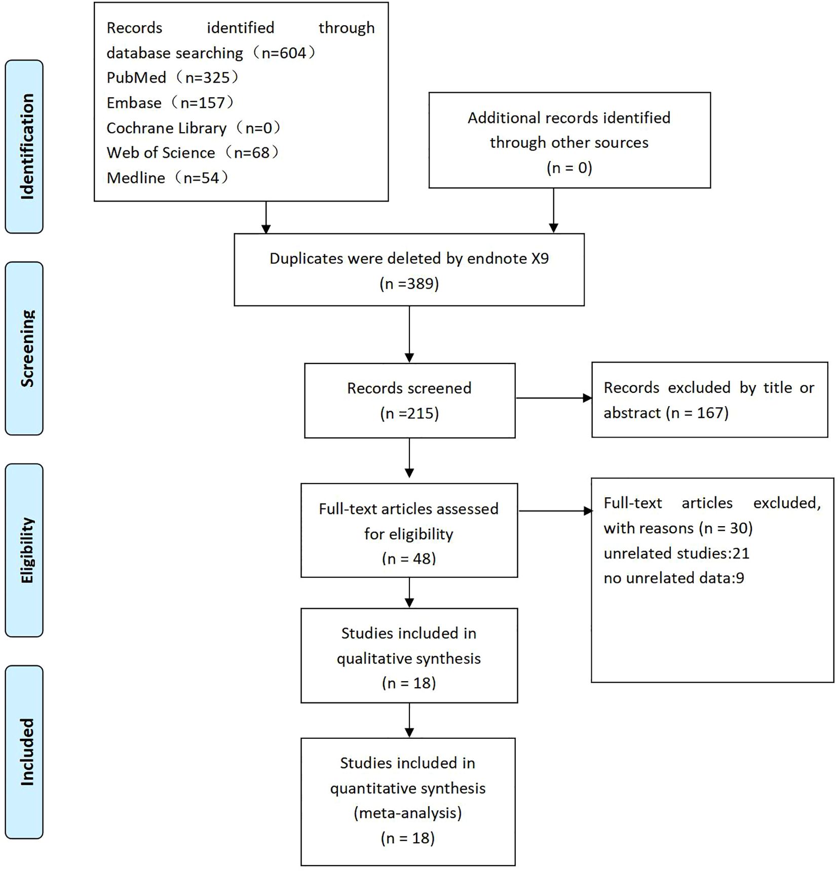 Two independent reviewers (CW and XW) screened the literature based on the predefined inclusion and exclusion criteria. Duplicate records were identified and removed using EndNoteX9 software, and abstracts and keywords were reviewed to eliminate irrelevant studies. Eligible studies were included in the meta-analysis after full-text assessment. Discrepancies were resolved through group discussion, and unresolved conflicts were adjudicated by the corresponding author (YX). The complete study selection process is illustrated in a PRISMA flow diagram (Figure 1).