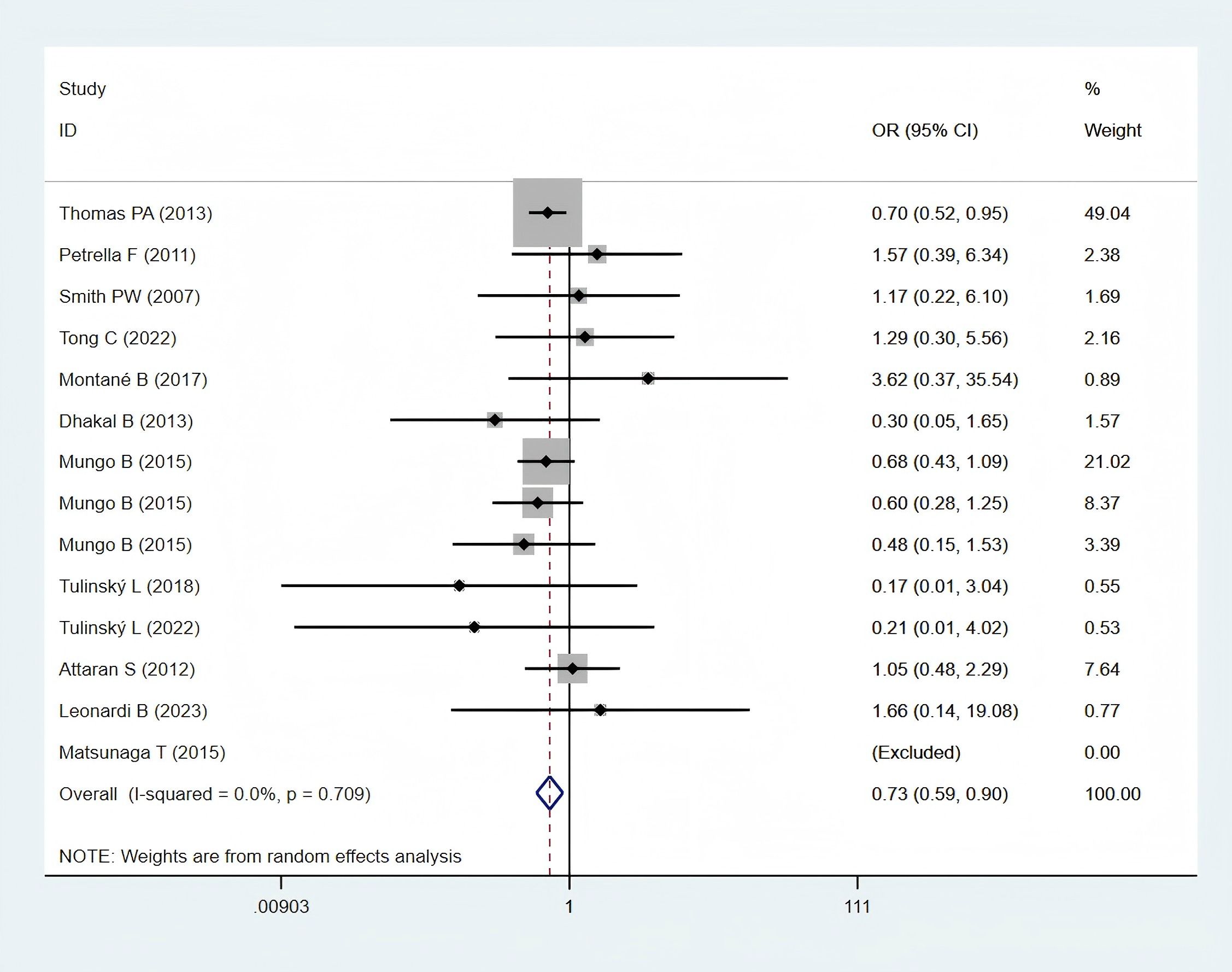 Twelve studies (11, 12, 24–26, 28, 30, 32, 35–38), encompassing 5,889 obese and 23,159 normal-weight patients, reported data on postoperative 30-day mortality and were included in the meta-analysis. A statistically significant difference in postoperative 30-day mortality was observed between the two groups (OR: 0.73; 95% CI: 0.59–0.90; P = 0.003; I² = 0.0%, P = 0.709) (Figure 2), with significantly lower mortality in the obese group.
