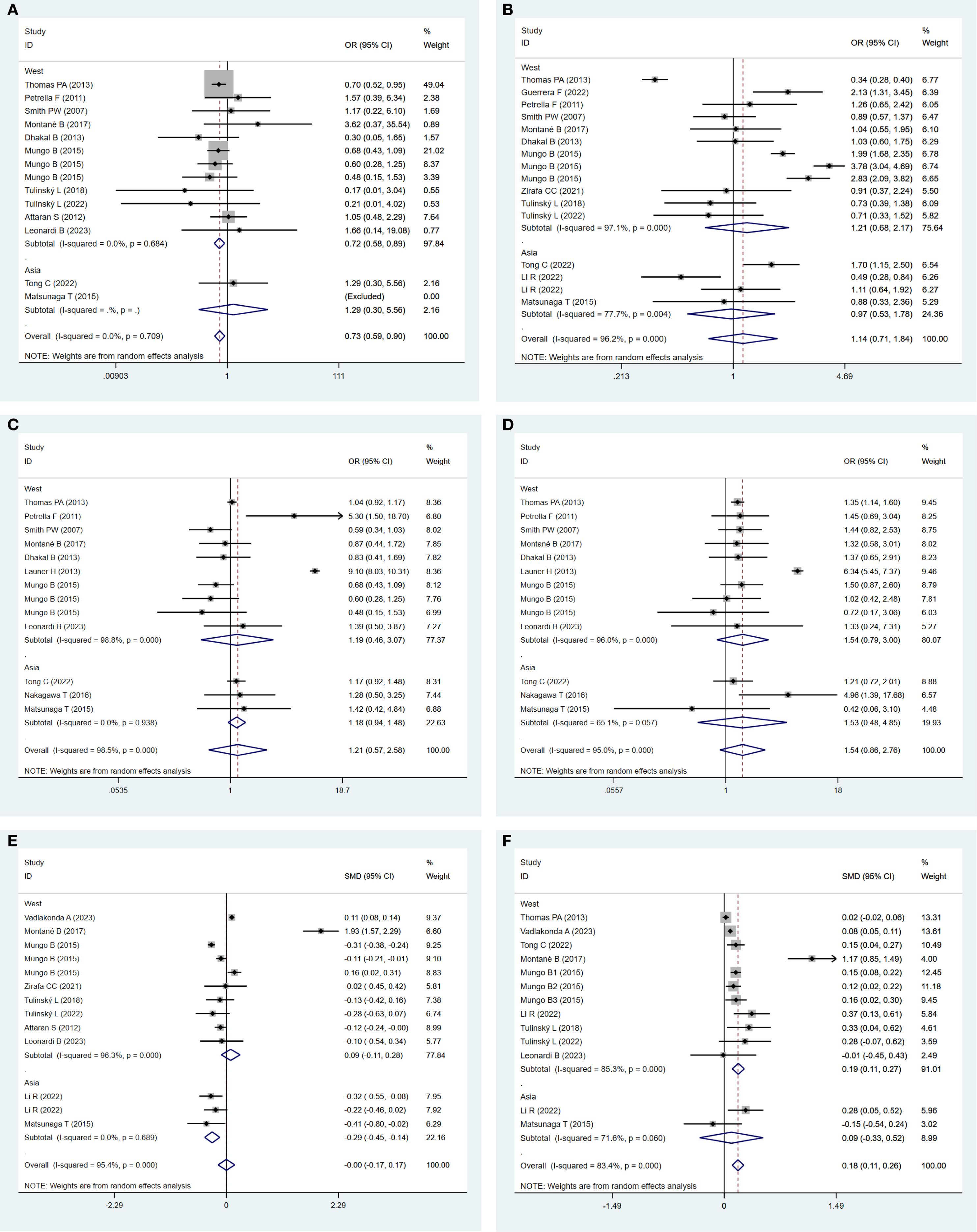 In Western regions, operation time in the obese group was significantly longer (SMD: 0.19; 95% CI: 0.11–0.27; P = 0.000; I² = 85.3%, P = 0.000). In contrast, a statistically non-significant difference was identified between the two groups in Asian populations (SMD: 0.09; 95% CI: −0.33 to 0.52; P = 0.662; I² = 71.6%, P = 0.060) (Figure 8F).