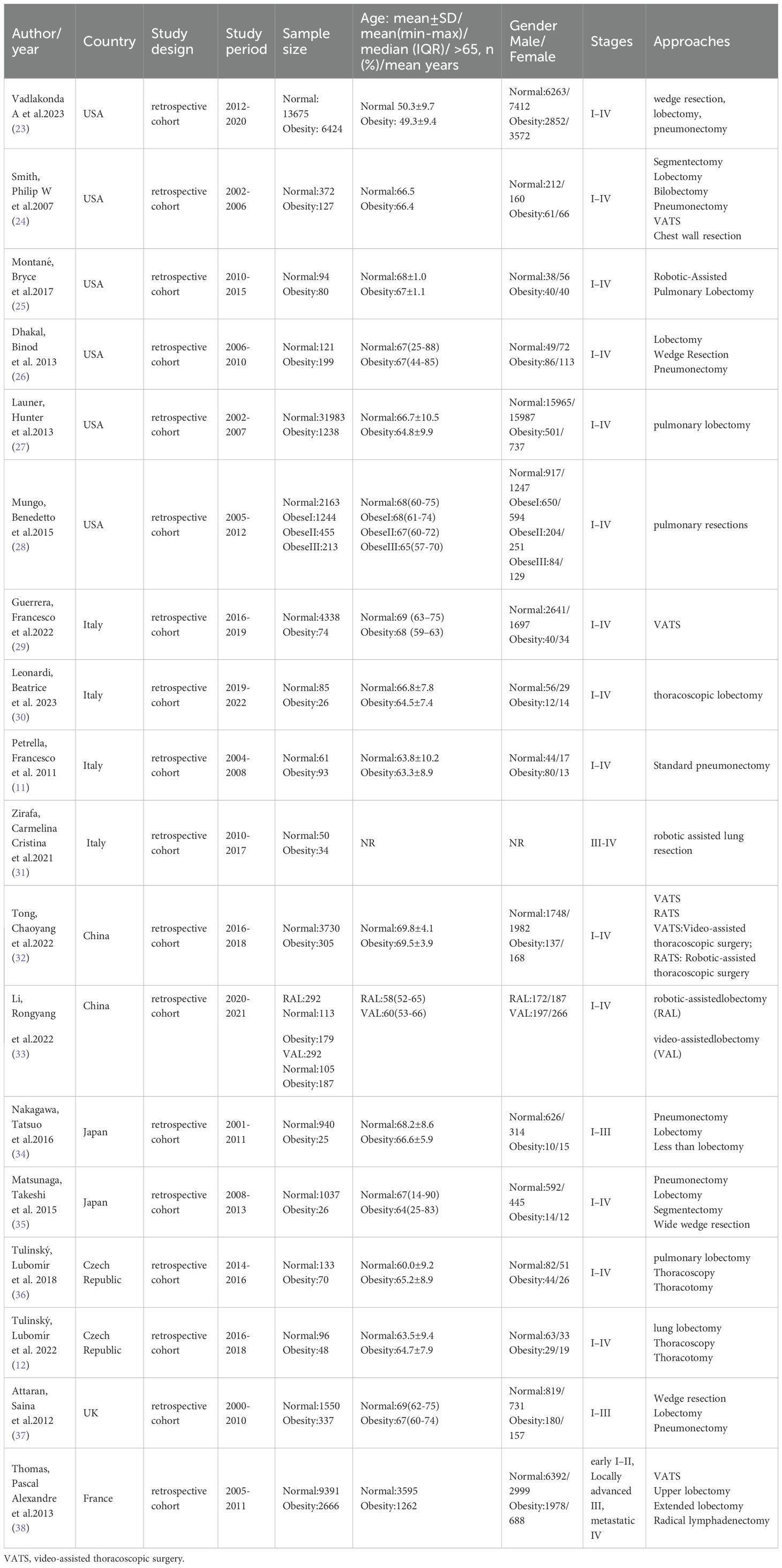 Eighteen studies were included in the meta-analysis, comprising 88,413 participants: 14,050 obese and 74,363 normal-weight patients who underwent lung cancer surgery. Six studies were conducted in the United States of America (23–28), four in Italy (11, 29–31), two in China (32, 33), two in Japan (34, 35), and two in the Czech Republic (12, 36). The remaining studies were performed in the United Kingdom (37) and France (38). Baseline characteristics demonstrated statistically non-significant differences between obese and normal-weight groups. The characteristics of the included studies are summarized in Table 1, and the study outcomes are presented in Table 2.