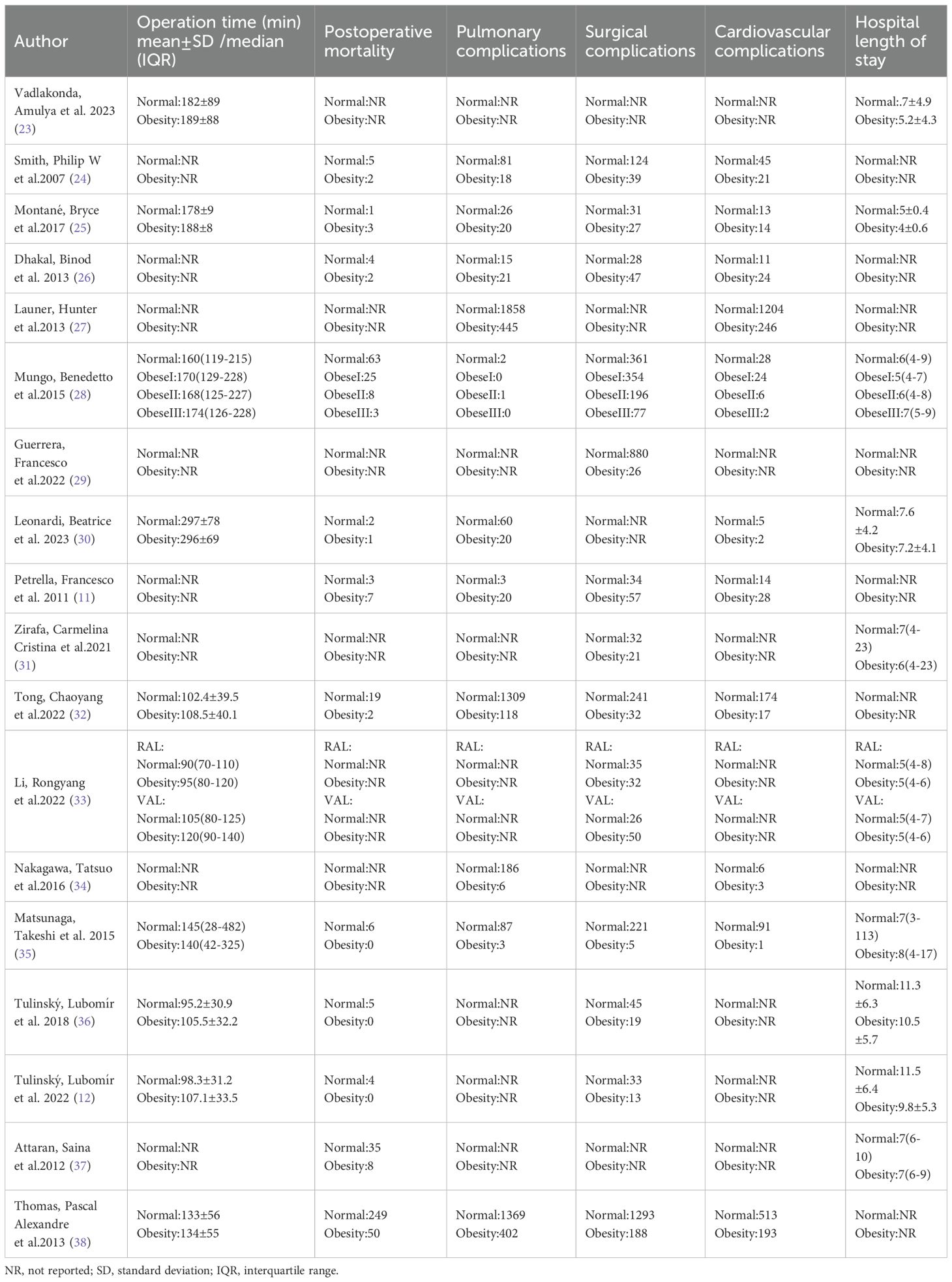 Li S et al. conducted a systematic review examining the prognostic significance of BMI in patients undergoing lung cancer surgery, with a particular emphasis on the “obesity paradox” (13). This paradox refers to the counterintuitive observation that obese patients may experience improved survival compared to those with normal or low BMI. The review concluded that higher BMI and obesity are associated with favorable in-hospital outcomes and enhanced long-term survival in patients undergoing lung cancer surgery, indicating that the obesity paradox may exist in this patient population. However, the authors noted that potential ethnic variations and confounding variables need to warrant investigation. Notably, the study did not comprehensively evaluate the impact of obesity on key perioperative outcomes, including operation time, postoperative complications, and mortality. Consequently, the conclusions of the previous review offer limited utility for preoperative risk stratification and the optimization of preoperative care. Furthermore, several recent studies published after 2016 have investigated the impact of obesity on perioperative outcomes following lung cancer surgery. To address this, a meta-analysis was conducted to systematically assess the influence of obesity on perioperative outcomes in patients undergoing lung cancer resection, with the objective of providing stronger evidence to inform clinical decision-making and patient management.