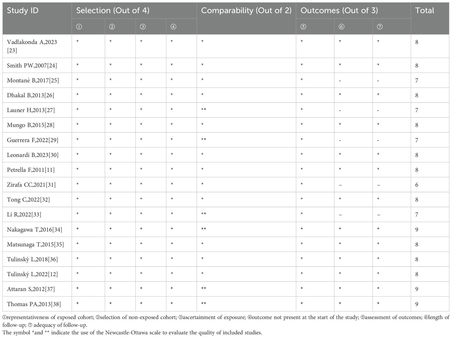 Based on the NOS, one study received six stars, four received seven stars, 10 received eight stars, and the remaining three received nine stars. All included studies were of high quality. Quality assessments according to the NOS are presented in Table 3.