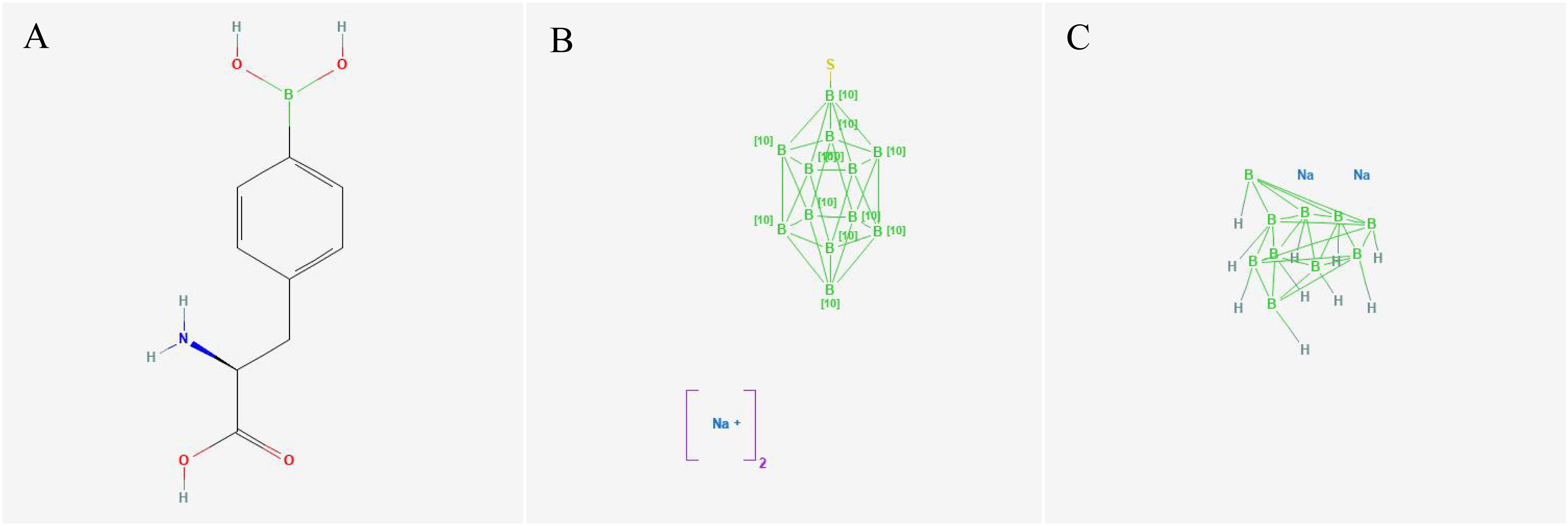 In BNCT, a binary therapy approach, both the boron delivery agent and the neutron source play crucial roles. The evolution of boron delivery agents can be categorized into approximately three generations. The first generation of boron delivery agents, exemplified by boric acid, lack tumor targeting properties and result in serious adverse reaction, making them unsuitable for clinical applications (43, 44). Boronophenylalanine (BPA), sodium borocaptate (BSH), and decahydrodecaborate (GB-10) representing the second generation of boron delivery agents, are the only three drugs currently approved for clinical use (45). Their molecular structures are shown in Figure 1. BPA enters tumor cells via active transport through amino acid transporters. Its therapeutic efficacy is limited by low boron content, poor solubility, insufficient accumulation at the tumor site, and a short retention time. BSH and GB-10, which lack receptor-mediated tumor selectivity, enters tumor cells via passive transport. This results in a low tumor to blood (T/B) boron ratio and causes significant side effects during treatment. Furthermore, both BPA and BSH exhibit the problem of heterogeneous distribution within tumors in their clinical applications, significantly impacting the effectiveness of BNCT (4648). Advancements in synthesis methods and a better understanding of biological characteristics have promoted the development of novel boron delivery agents. The third generation of boron delivery agents encompasses a range of low molecular weight compounds like amino acids, peptides, polyamines, nucleosides, carbohydrates, and porphyrins, as well as high molecular weight reagents such as liposomes, proteins, monoclonal antibodies, and nanoparticles (49, 50).
