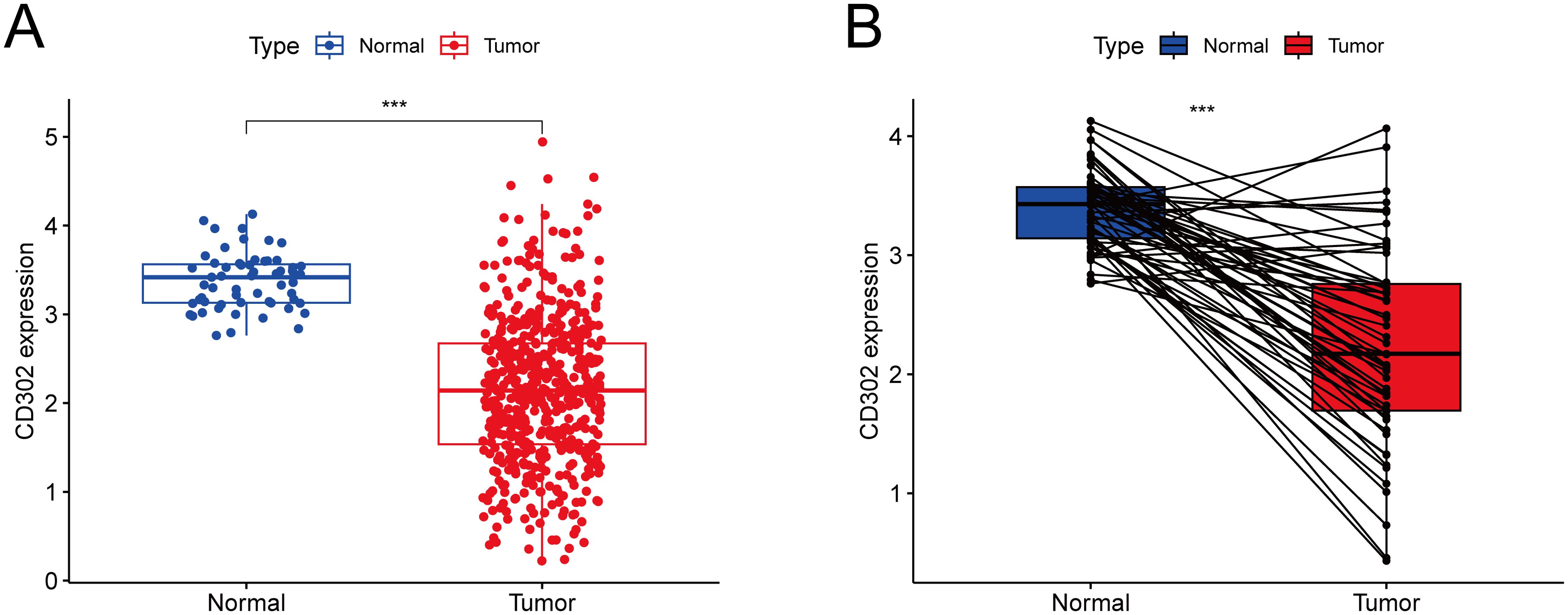 Gene expression profiling of 598 LUAD samples (59 normal tissues and 539 tumor tissues) from The Cancer Genome Atlas (TCGA) database demonstrated that CD302 expression was significantly downregulated in both unpaired and paired LUAD tissues compared to normal controls (both P < 0.001) (Figure 1).
