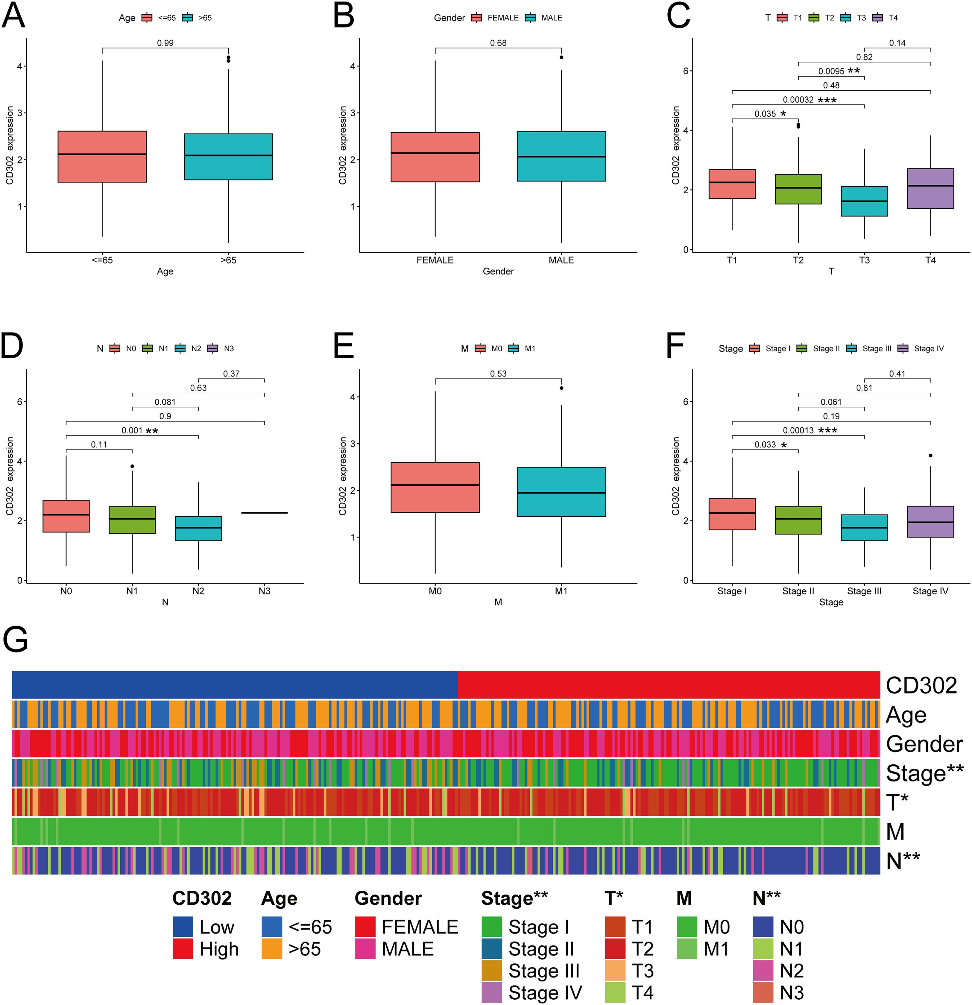 Figure 2. CD302 was differentially expressed in age (A), gender (B), T stage (C), N stage (D), M stage (E) and stage (F). (G) heatmap of CD302 expression in LUAD tissues based on clinicopathological features. *P<0.05, **P<0.01, and ***P<0.001.
