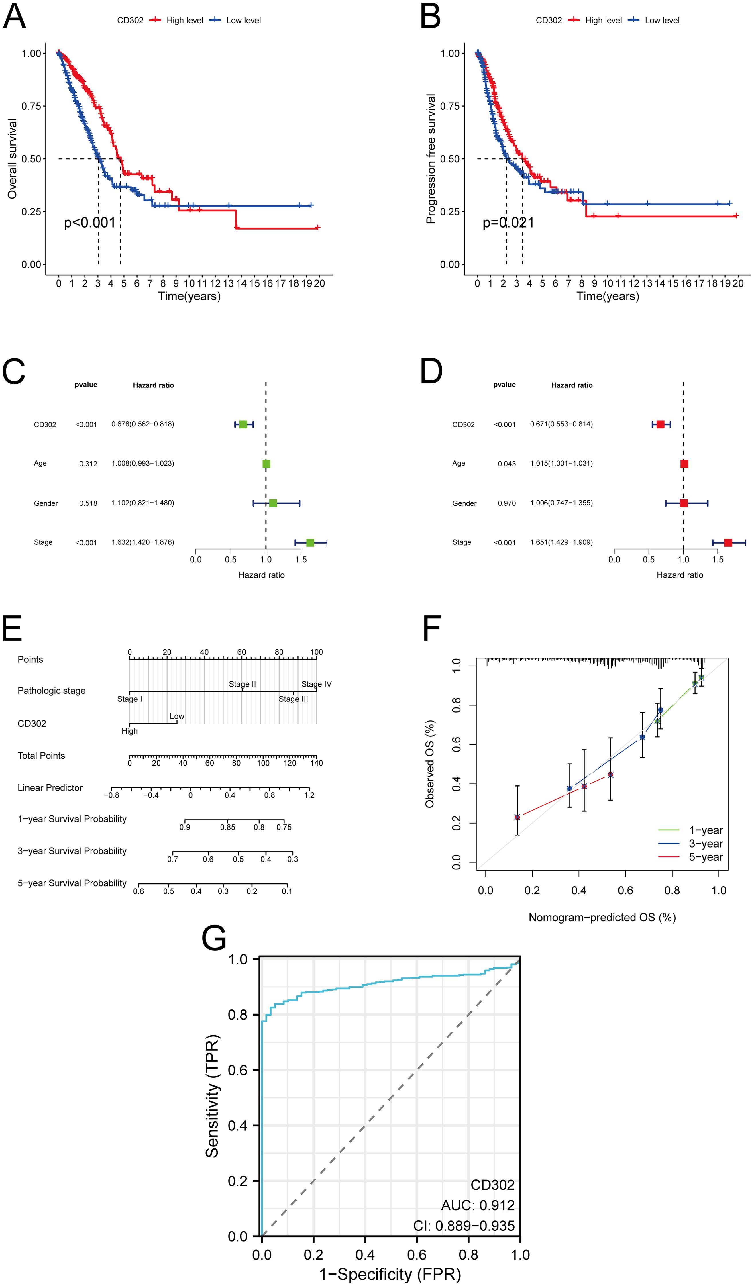 Figure 3. Prognostic, predictive, and diagnostic significance of CD302 expression in lung adenocarcinoma. (A, B) Association between CD302 expression levels and OS or PFS in LUAD patients. (C, D) Univariate and multivariate Cox regression analyses. (E, F) Nomogram model for predicting 1-, 3-, and 5-year survival probabilities and corresponding calibration curves assessing prediction accuracy. (G) ROC curve analysis evaluating the diagnostic efficacy of CD302 in LUAD. *P<0.05 and ***P<0.001.