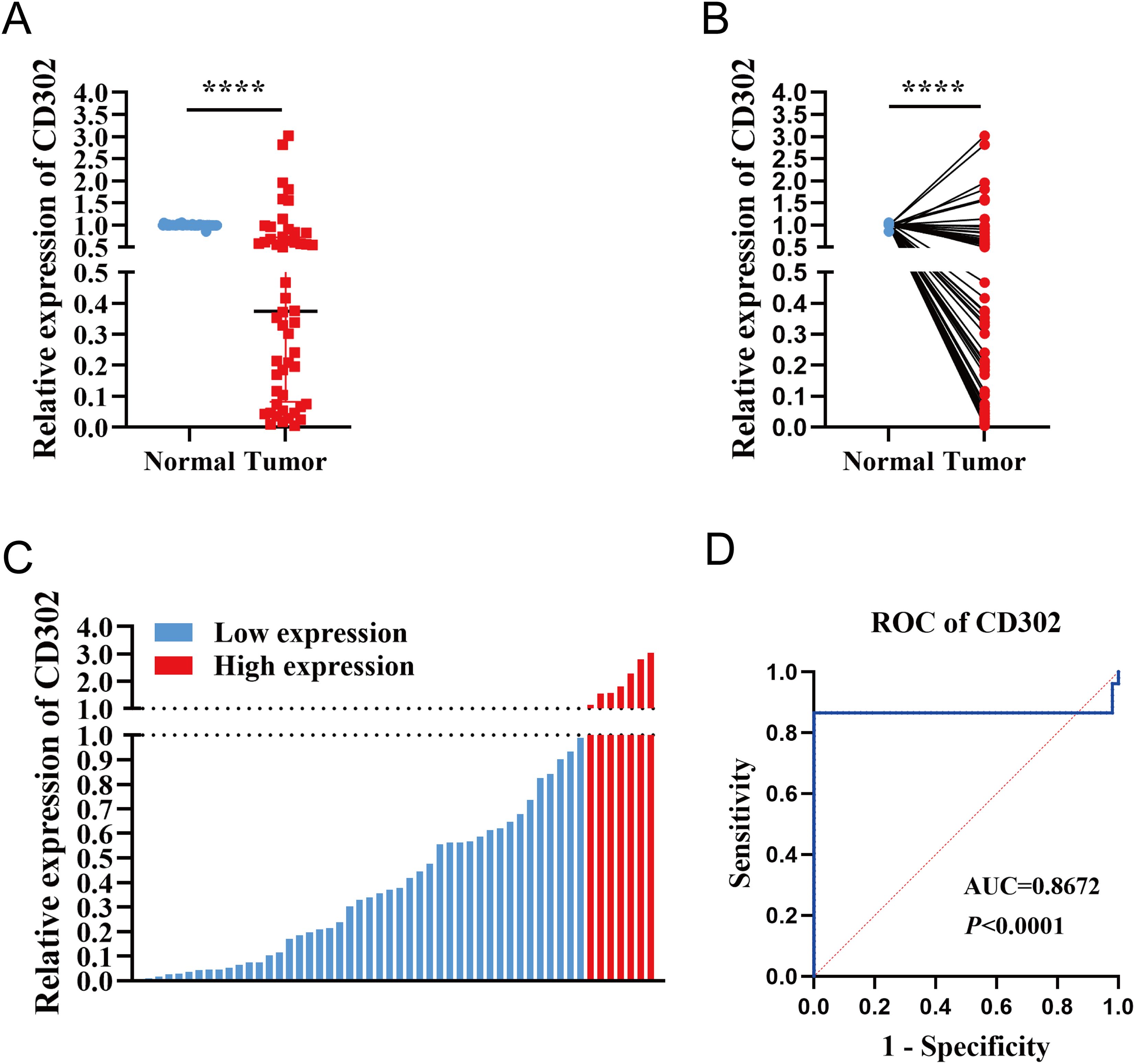 A total of 52 paired NSCLC samples were included in this study. The cohort comprised 29 males and 23 females, aged 20–76 years (mean age: 58 years), with 27 patients aged ≤58 years and 25 patients aged >58 years. TNM staging classified 41 cases as stage I, 6 as stage II, and 5 as stage III. Tumor differentiation grades included 14 well-differentiated, 23 moderately differentiated, and 15 poorly differentiated cases. Pathological subtypes consisted of 42 lung adenocarcinomas and 10 squamous cell carcinomas (Supplementary Table S11). RT-qPCR analysis of CD302 expression in 52 NSCLC tissues and paired adjacent normal tissues revealed that CD302 levels were significantly lower in tumor tissues compared to adjacent normal tissues, with 45 cases showing downregulation and only 7 cases exhibiting upregulation in both unpaired and paired comparisons (Figures 4A-C). Receiver operating characteristic (ROC) curve analysis demonstrated a diagnostic AUC of 0.8672 (P < 0.0001), indicating strong discriminative potential of CD302 expression in tissue samples (Figure 4D).
