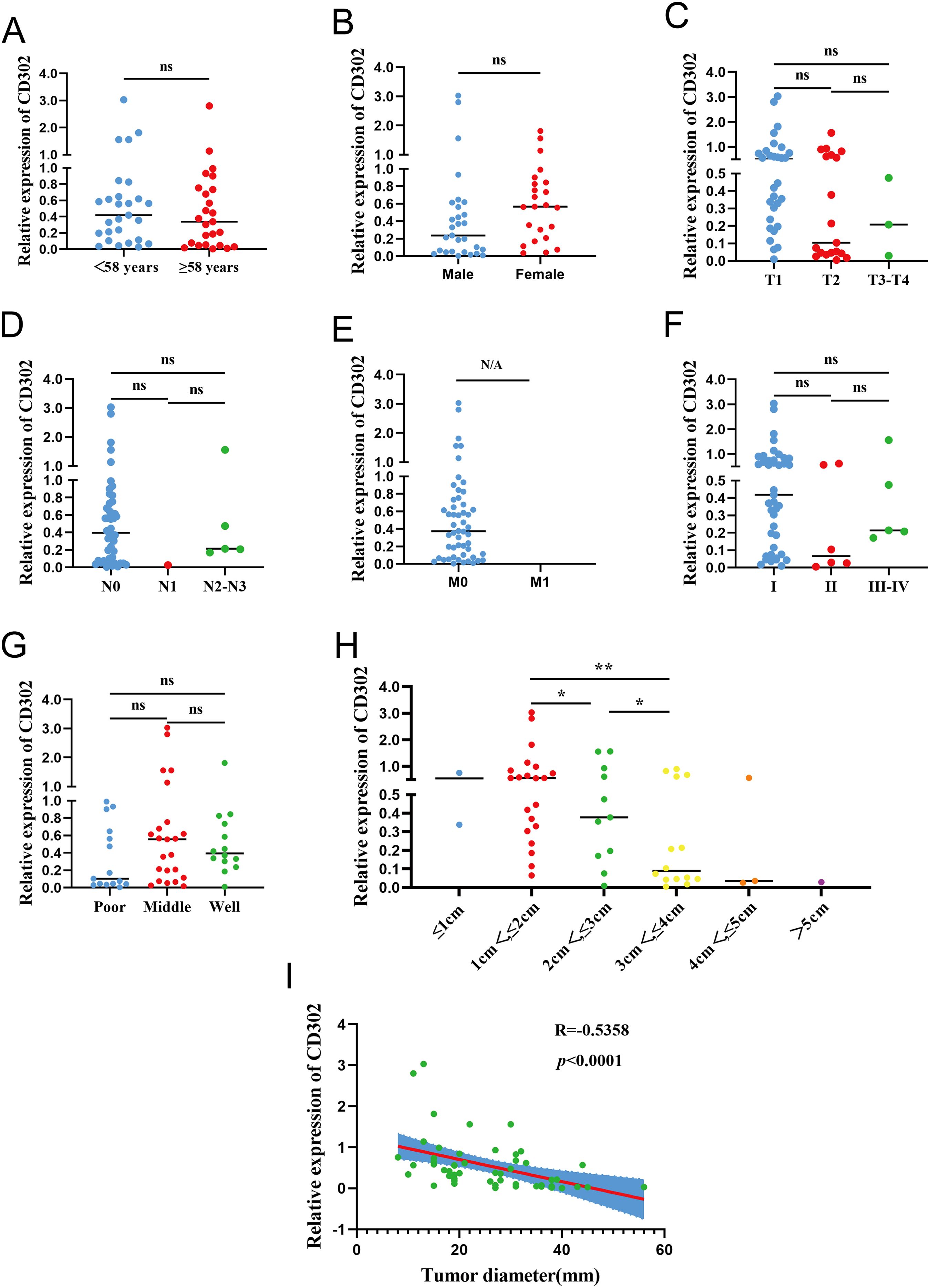 Figure 5. CD302 Expression and clinicopathological correlation in clinical NSCLC tissues. CD302 was differentially expressed in age (A), gender (B), T stage (C), N stage (D), M stage (E), stage (F), differentiation (G) and tumor diameter (H). (I) The correlation between tumor diameter and CD302 was analyzed using Spearman correlation analysis. ns = not significant, *P<0.05 and **P<0.01. N/A, not applicable.