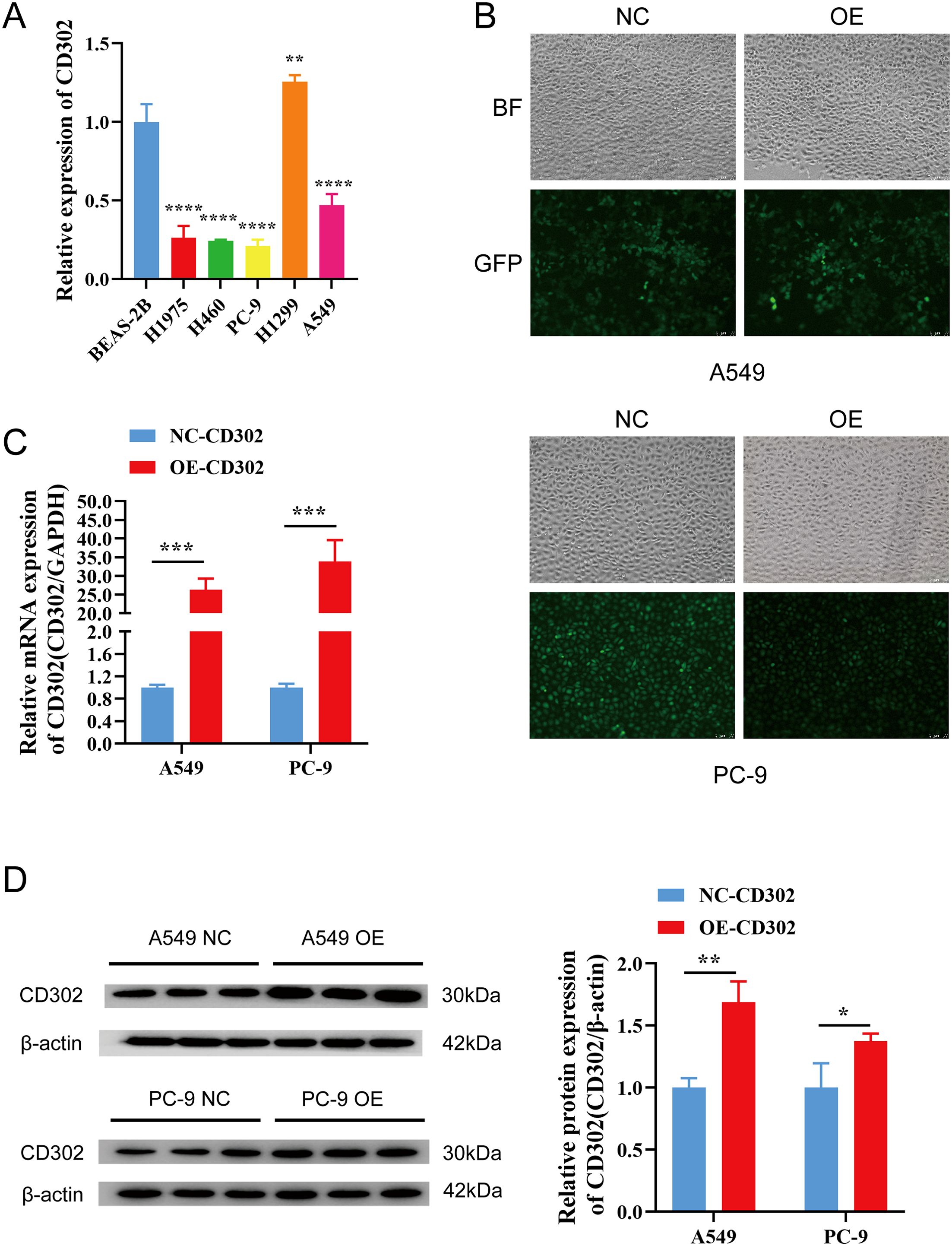 Figure 6. Expression of CD302 in NSCLC cells and construction of the overexpression cell model. (A) Expression of CD302 in normal lung epithelial cells and NSCLC cells. (B) Transfection efficiency of lentiviral infection in A549 and PC-9 cells observed under a fluorescence microscope. (C, D) Expression of CD302 in transfected cells detected by qRT-PCR and Western blot. *P<0.05, **P<0.01, ***P<0.001, and ****P<0.0001.