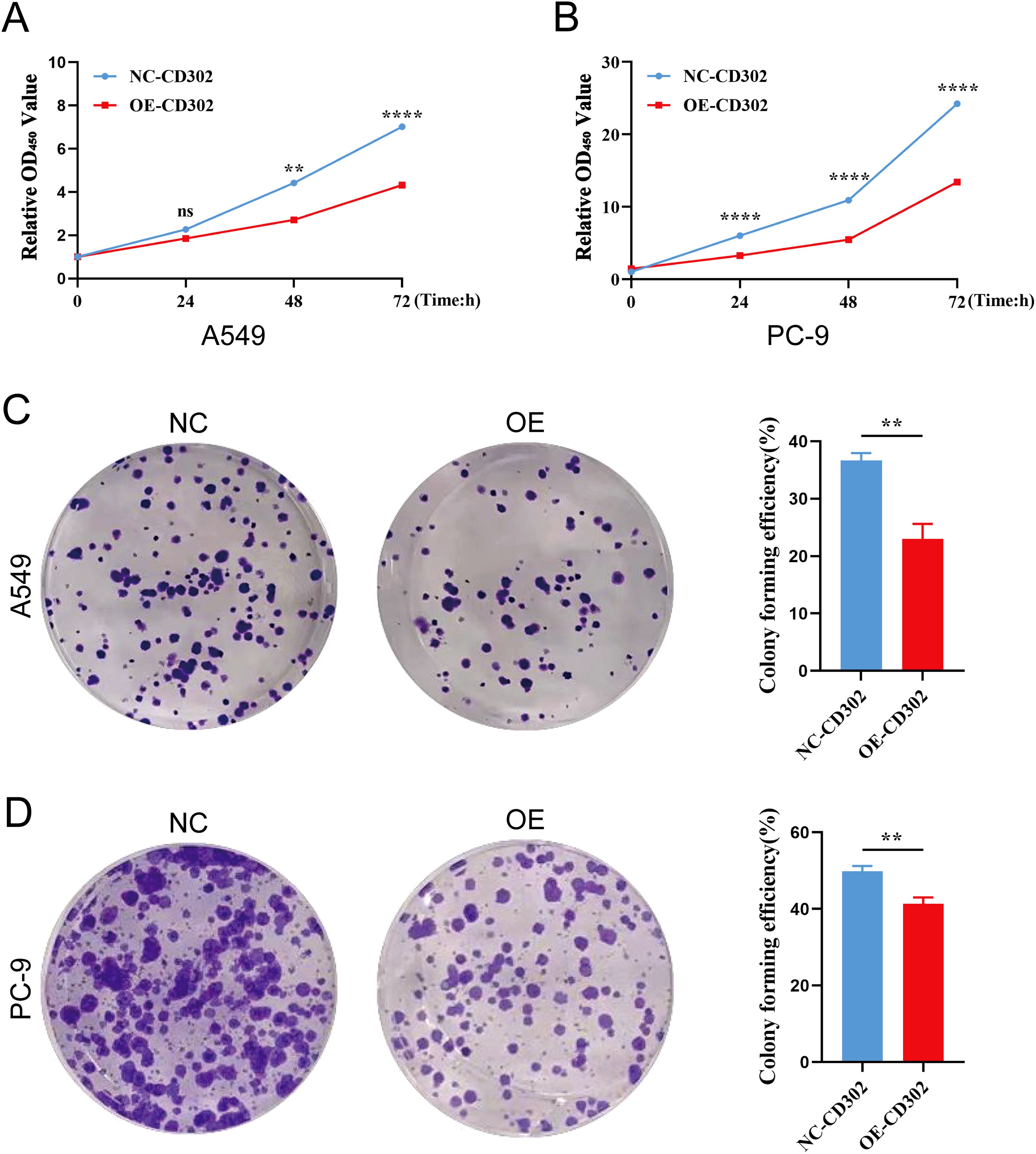 Figure 7. Effects of CD302 on NSCLC cell proliferation. (A, B) CCK-8 assay evaluating the effect of CD302 on the proliferation viability of A549 and PC-9 cells. (C, D) Colony formation assay assessing the impact of CD302 on the colony-forming ability of A549 and PC-9 cells. **P<0.01 and ****P<0.0001.